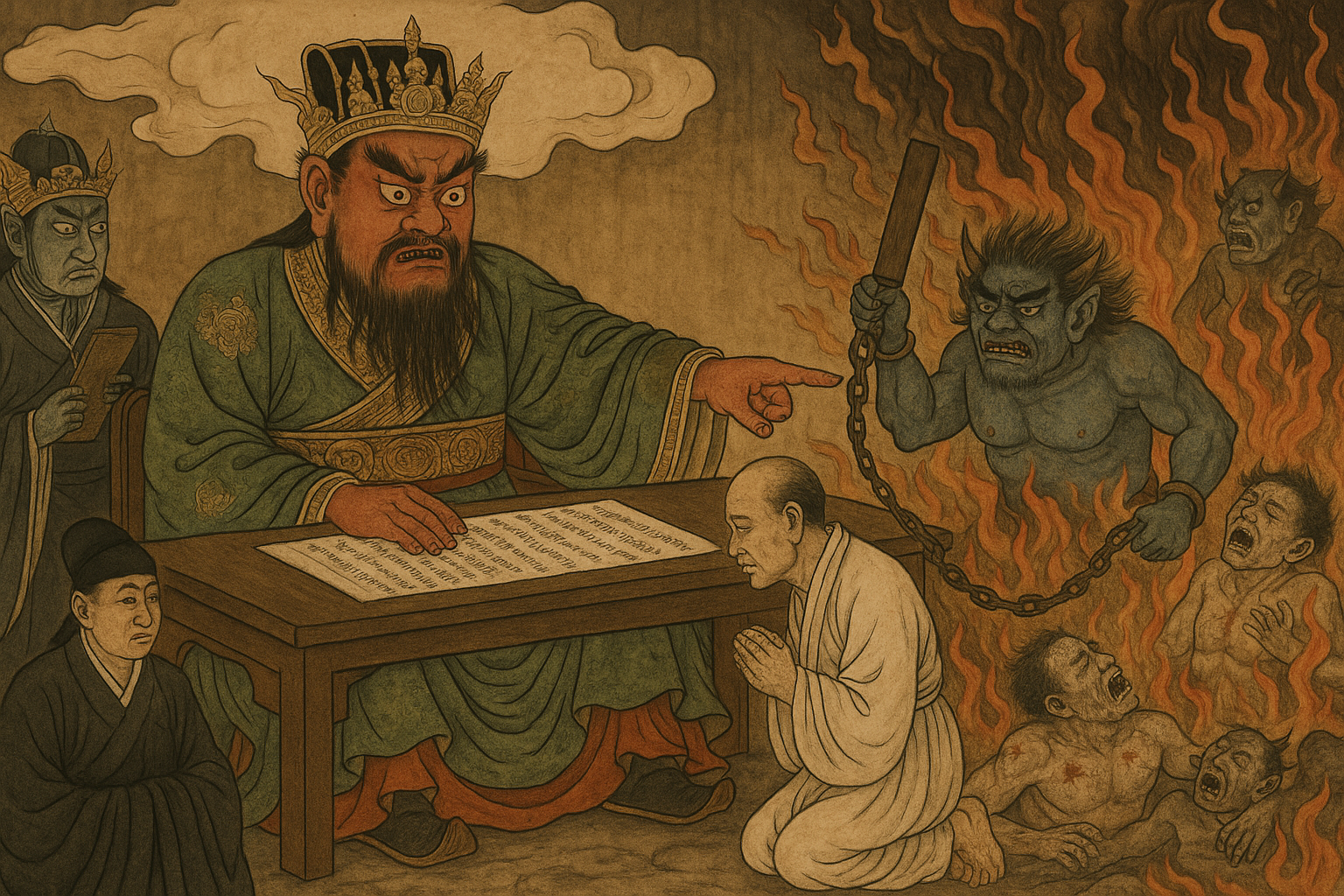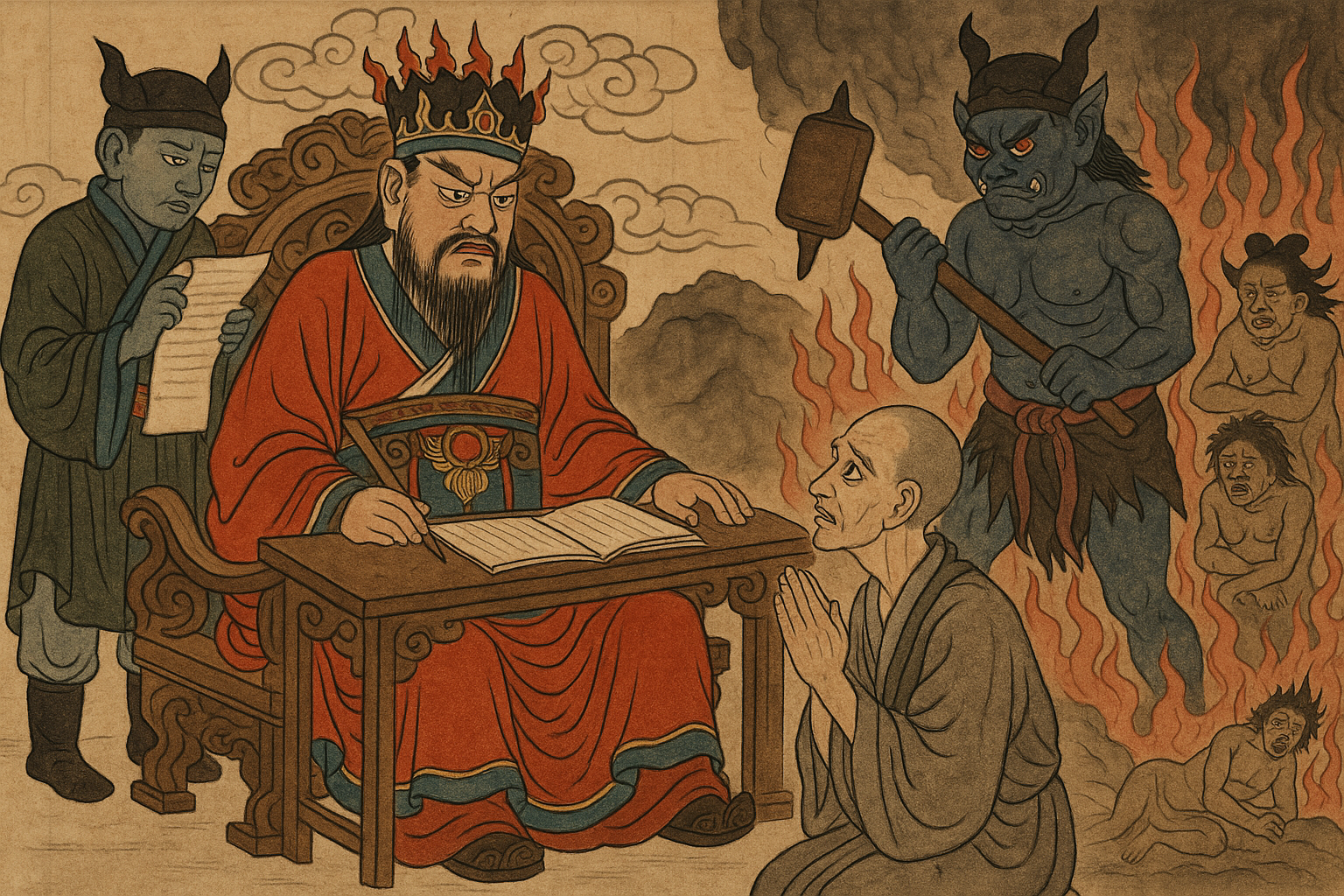 "대왕님, 저는 부처님의 가르침을 따라 살려고 노력했습니다. 하지만 번뇌를 완전히 끊지 못했고, 때로는 작은 악심을 품기도 했습니다. 그 모든 것이 제 업보입니다. 어떤 벌이든 달게 받겠습니다."