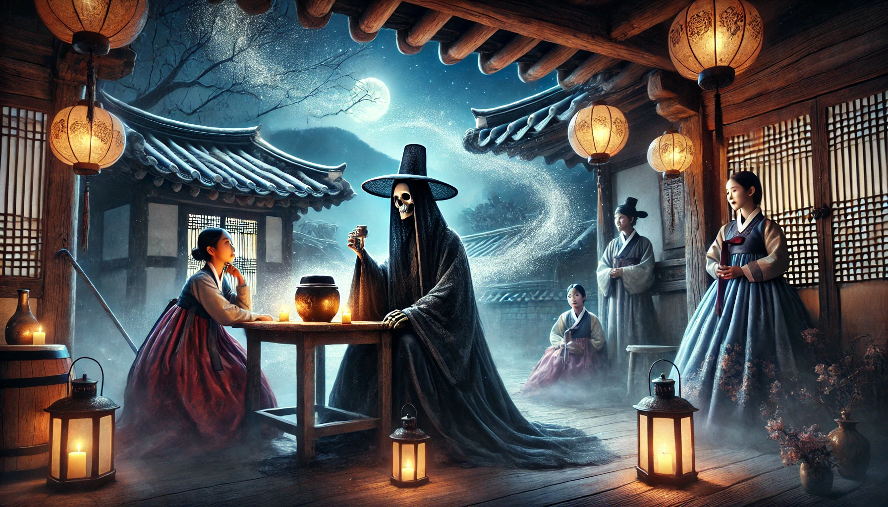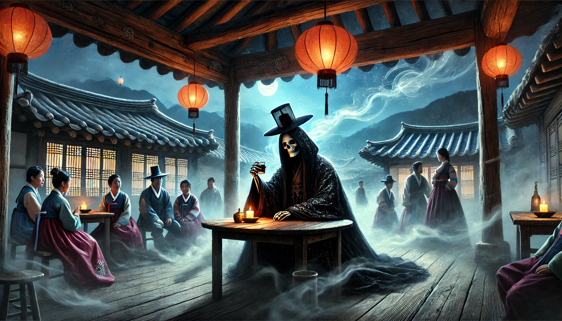 손님들의 흥겨운 대화가 오가는 가운데, 주막 문이 열리며 한 낯선 사내가 들어섰습니다. 검은 갓에 검은 도포를 입은 그는 얼굴이 하얗고 창백했으며, 눈빛은 이상하게 깊고 어두웠습니다. 주막의 시끌벅적한 분위기가 일순간 조용해졌습니다. 모든 시선이 그 낯선 손님에게 쏠렸습니다.