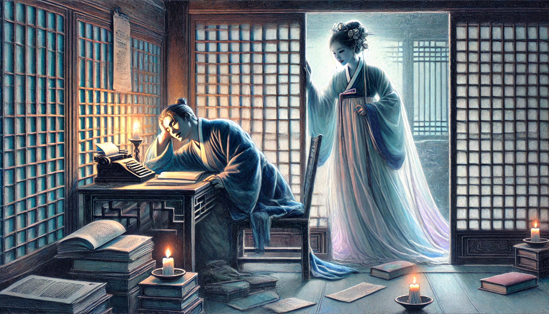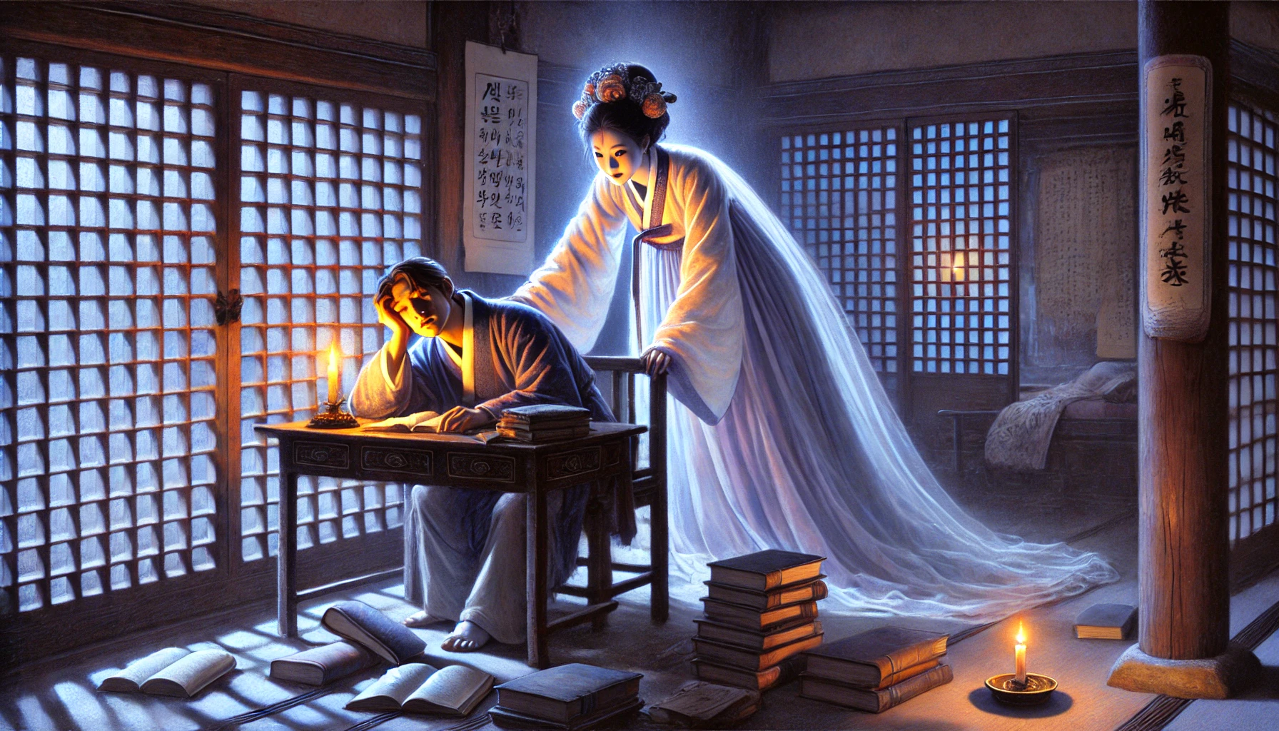 얼마나 지났을까. 깜빡 잠이 들었던 모양이다. 희미한 의식 너머로, 누군가 자신의 이름을 속삭이는 소리가 들려왔다. 방 안에는 자신 말고는 아무도 없는데. 그는 헛것을 들었으려니 생각하며, 무거운 눈꺼풀을 힘겹게 들어 올렸다. 그리고 그 순간, 그는 자신의 눈앞에 펼쳐진 광경에 숨을 쉴 수조차 없었다. 방 안의 등불은 이미 기름이 다해 꺼져 있었는데, 방 안은 이상하게도 보름달이 뜬 밤처럼, 은은하고 신비로운 빛으로 가득했다. 그리고 그의 눈앞에, 그의 낡은 목판 책상 건너편에, 난생 처음 보는 한 여인이 소리 없이 앉아 그를 바라보고 있었다.