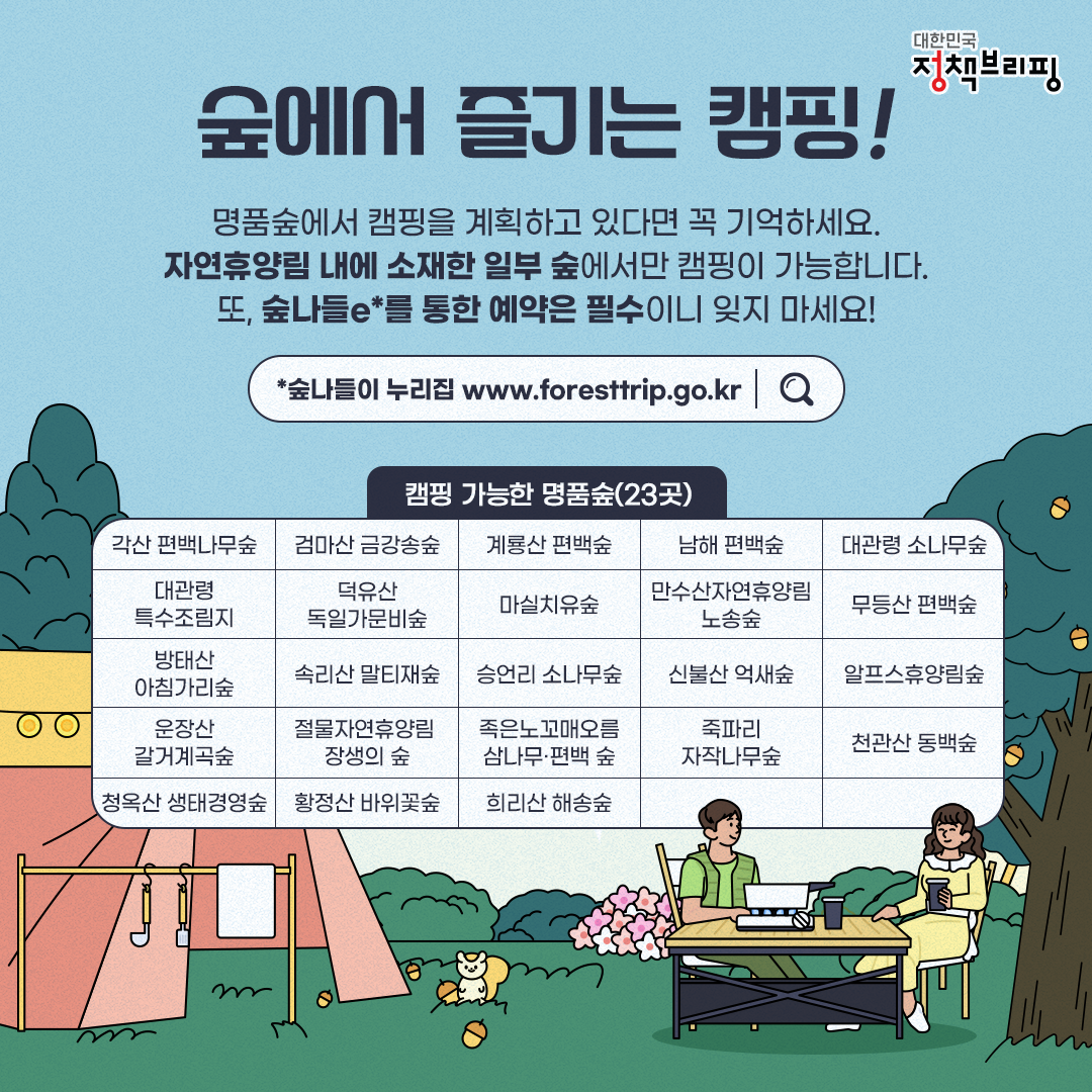일부 명품숲에서는 캠핑을 즐길 수 있는데요.