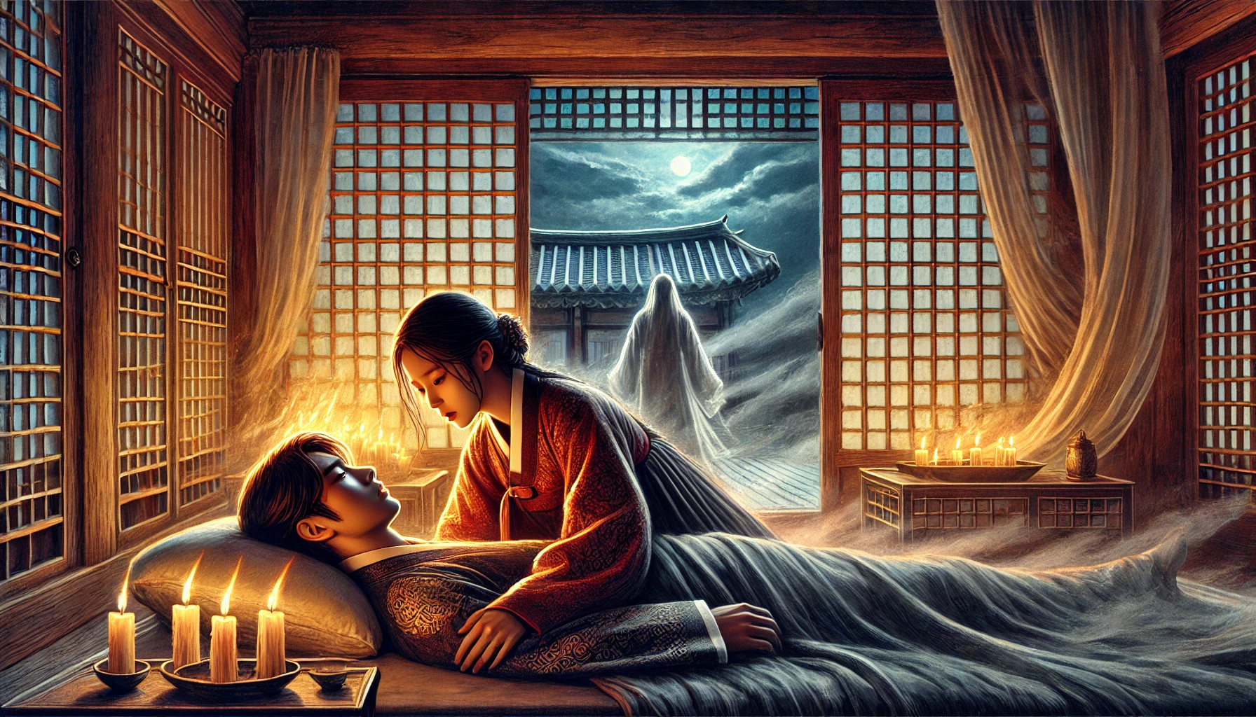 목욕을 마친 이생을 먼저 방으로 들여보낸 후, 민씨는 거울 앞에 앉았습니다. 그녀는 평소 즐겨 입던 수수한 무명옷을 벗어던졌습니다. 장롱 깊숙한 곳에서, 혼례 때 입었던 붉은 비단 속적삼을 꺼냈습니다. 얇고 투명한 붉은 비단은 그녀의 하얀 살결을 더욱 도드라지게 만들었습니다. 그녀는 입술에 붉은 연지를 찍고, 머리를 풀어헤쳤습니다. 거울 속에 비친 여인은 현모양처 민씨가 아니었습니다. 남편을 홀려 생명을 불어넣을 매혹적인 여인이 그곳에 있었습니다. 그녀는 마지막으로 창호지 문 틈새를 꼼꼼히 점검했습니다. 차가운 저승의 바람이 바늘구멍 하나라도 통과하지 못하도록, 문풍지를 덧바르고 문고리를 단단히 걸어 잠갔습니다. 방 안은 아궁이의 열기와 촛불의 온기, 그리고 민씨가 내뿜는 비장한 열기로 후끈했습니다.