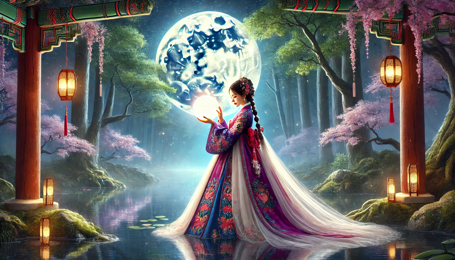 아란은 신발을 벗고 조심스럽게 연못으로 발을 디뎠다. 물은 차갑게 그녀의 피부를 감싸며 가볍게 소용돌이쳤다. 그녀가 한 발 한 발 다가갈수록 연못 중앙의 여의주는 점점 더 강하게 빛났다. 마치 달님이 그녀를 인도하고 있다는 느낌이 들었다.