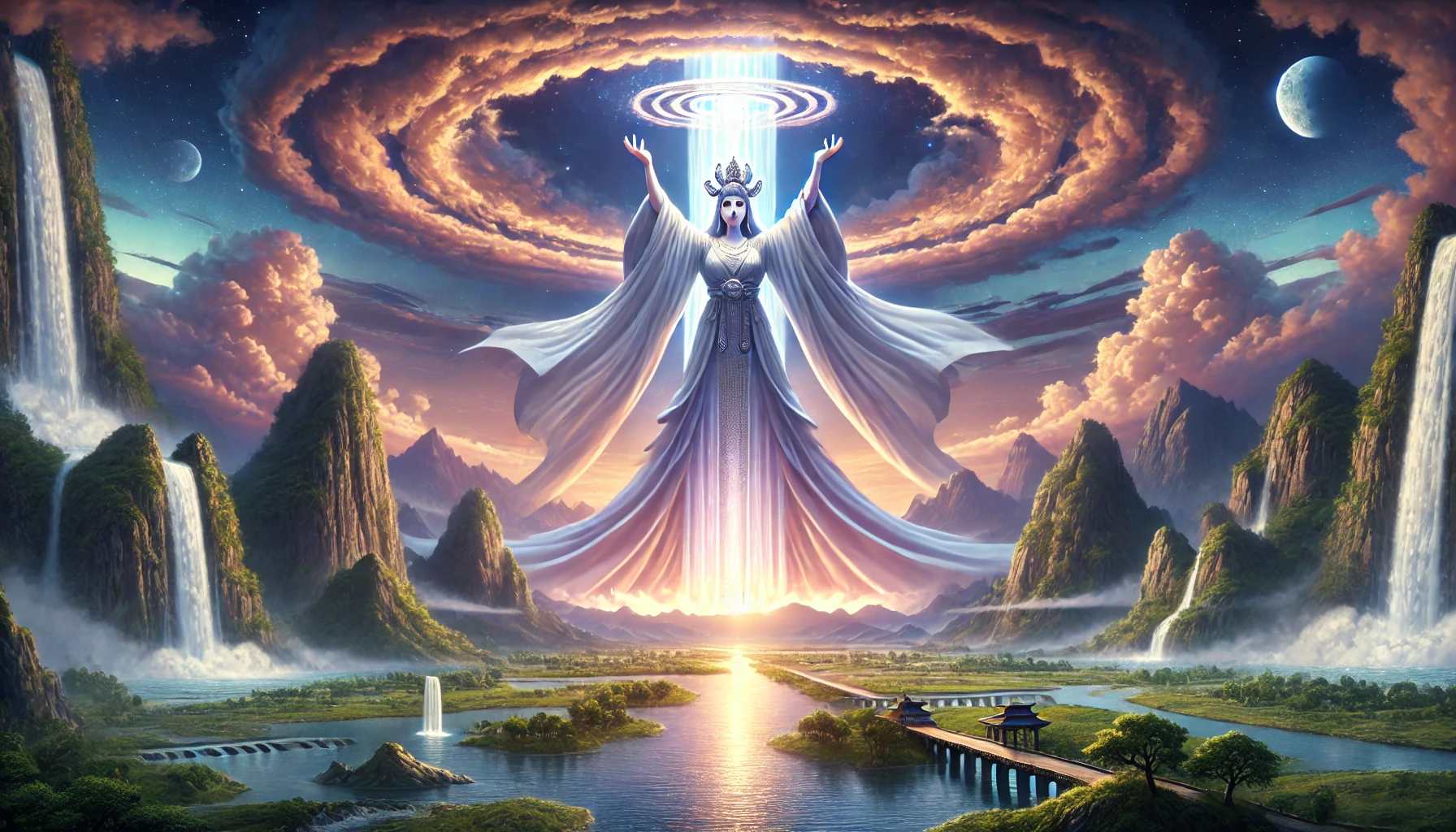 그녀가 강물에 손을 담그자 물이 거대한 소용돌이를 이루며 하늘로 치솟았다. 이 물기둥은 대지와 하늘 사이의 생명을 이어주는 상징으로 세워졌다. 주변의 사람들은 두려움과 경외심에 사로잡혀 멀리서 지켜볼 뿐, 아무도 다가가지 못했다.