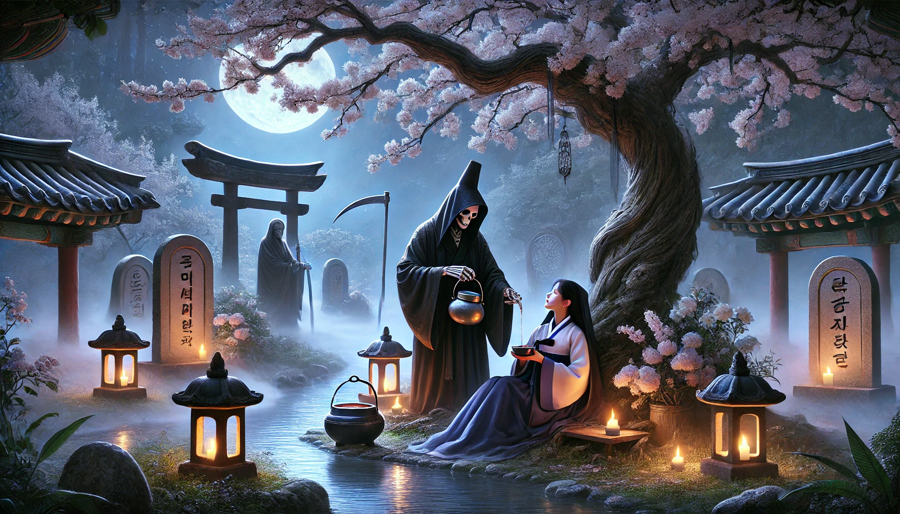 "부인, 제가 한 가지 제안을 드려도 될까요? 저승에는 '꿈의 연못'이라는 곳이 있습니다. 그곳에서 당신은 딸의 꿈에 찾아갈 수 있습니다. 비록 현실에서는 닿을 수 없지만, 꿈속에서는 딸을 만나고 위로할 수 있지요."