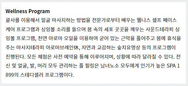 여러 시설 중에서도 가장 많은 이들의 사랑을 받는 공간은 클럽 2층의 가든 푸실이다. ‘풀이 우거진 마을’이라는 뜻의 푸실은 거대한 식물원을 닮은 힐링 공간이다. 100여 종에 이르는 다양한 나무와 식물 사이사이에 초록빛 솔잎 족욕탕, 보랏빛 아로마 족욕탕, 보글보글 물거품이 올라오는 버블 족욕탕이 흐른다. 숲속 작은 길을 따라 산책하며 흐르는 시냇물에 발을 담그는 느낌이 물씬 난다.