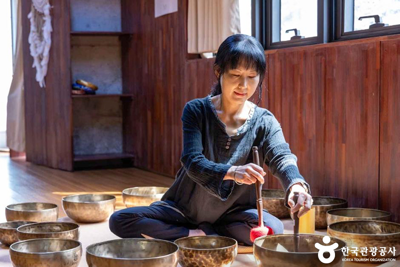 빛과 소리, 향기로 심신에 안정을 주는 오감테라피실에서 가장 돋보이는 공간은 사운드테라피실. 눈을 감고 거대한 손 아래 세 개의 크리스탈 싱잉볼에서 퍼지는 음과 진동을 온몸으로 받아들이면 가슴을 누르던 무게가 조금씩 가벼워지는 듯하다.