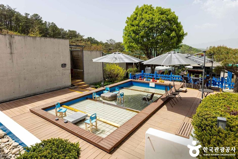 푸실에서 연결되는 야외 체험존은 더욱 다채롭다. 커다란 파라솔 아래 쑥, 금은화, 홍화 등 생약초 성분의 족욕탕이 이어지고, 족욕탕 앞에는 주먹만 한 자갈이 깔린 차가운 물길이 흐른다. 10분 정도 뜨거운 족욕을 즐긴 후 차가운 물에서 자갈을 밟으며 10여 분 걸으면 혈액순환에 더 많은 도움이 된다는 크나이프 요법 체험 공간이기도 하다.