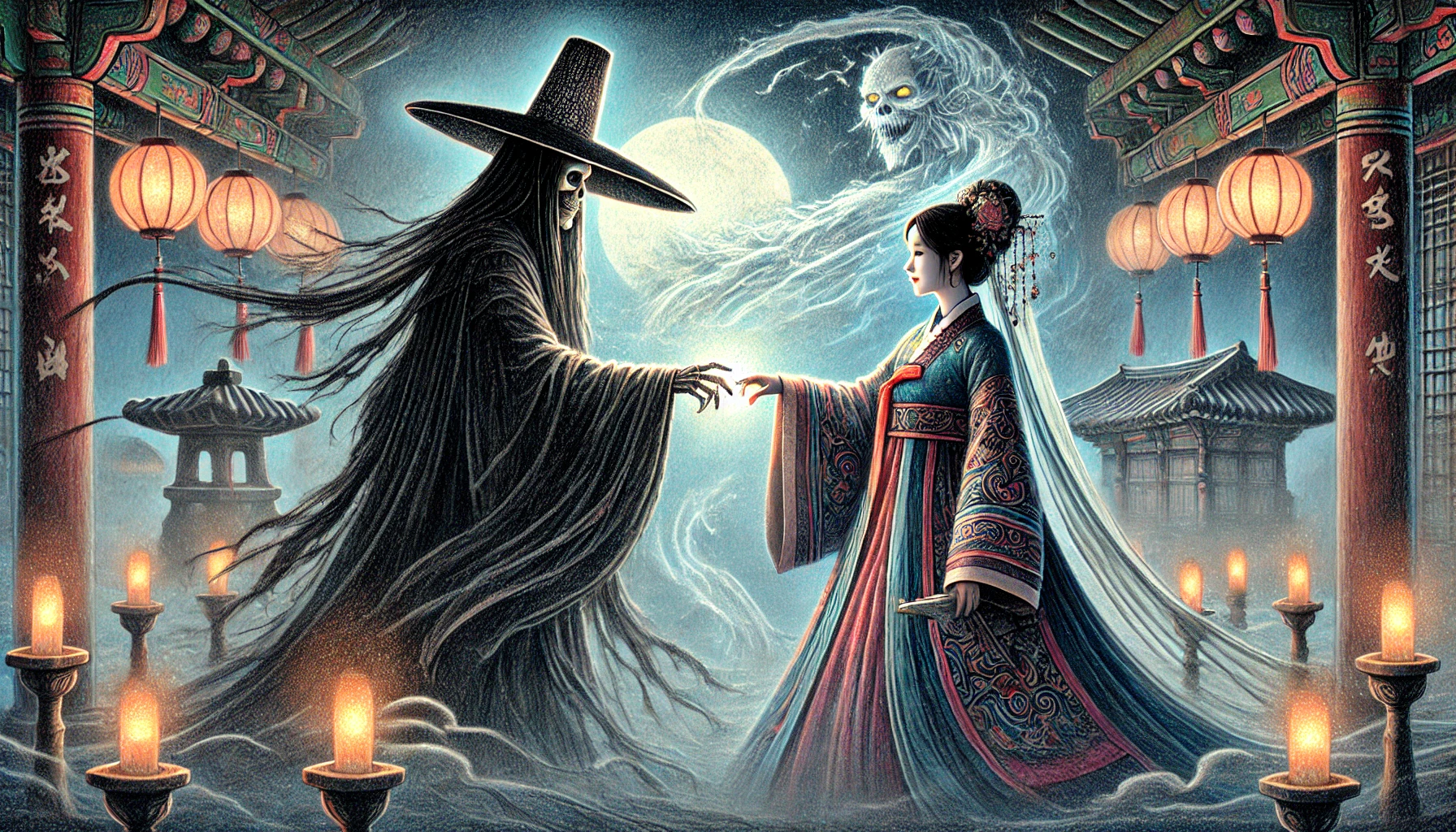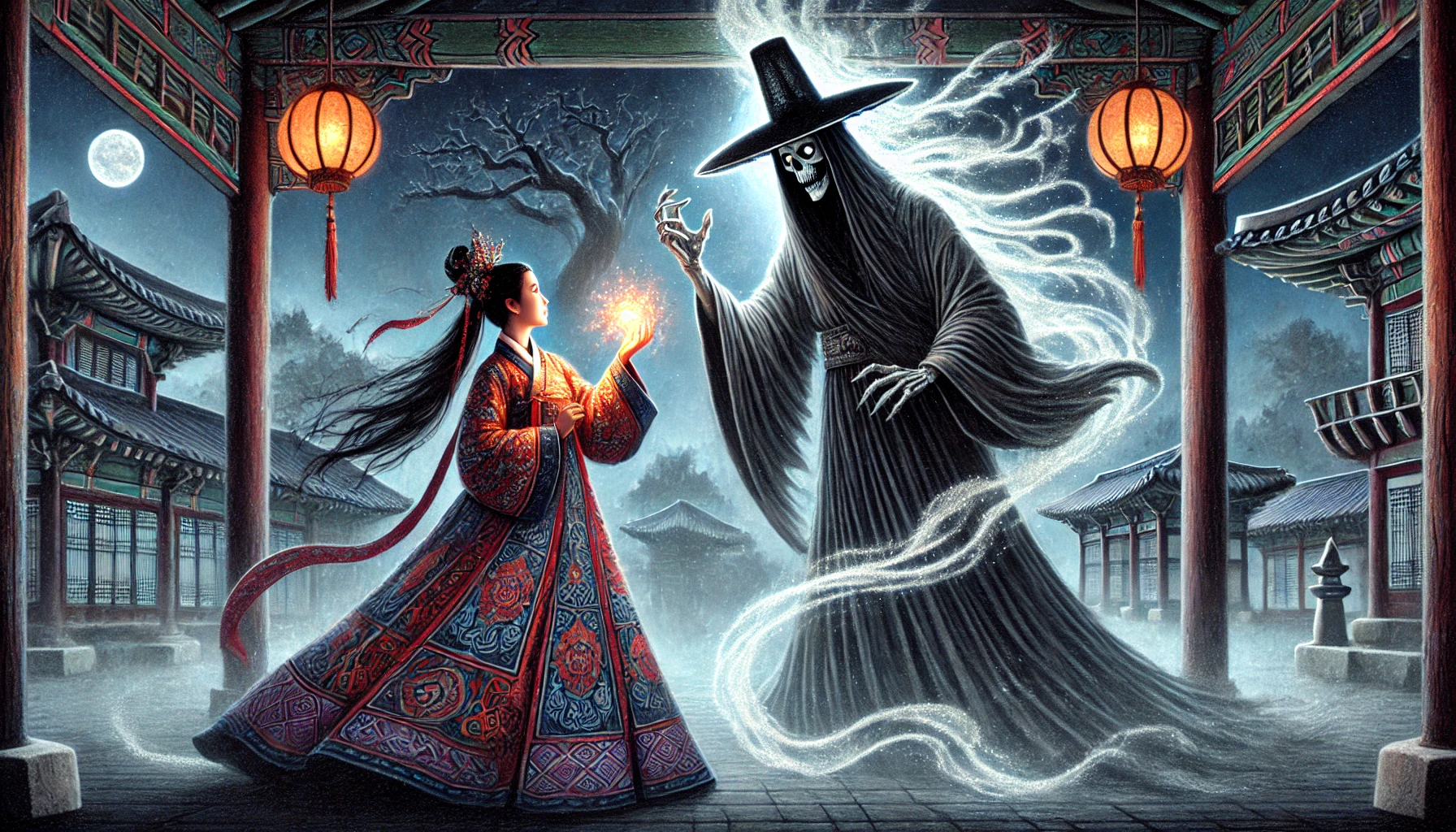 저승사자가 월화를 내려다보며 차가운 목소리로 말했다. "무당이여, 네가 지금 무슨 말을 하는지 아느냐?"