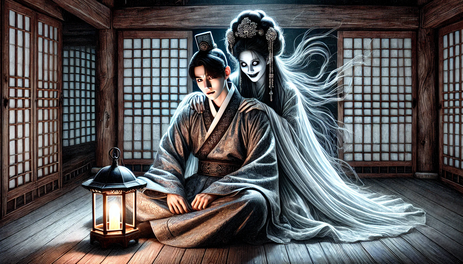 머릿속이 아득해졌습니다. 이게 대체 무슨 기괴한 일이란 말인가. 지난 보름간 내 품에 안겨 웃고 울던 그 여인이, 밤마다 나의 모든 것을 앗아갈 듯 뜨겁게 사랑을 나누었던 월향이, 이미 일 년 전에 죽은 사람이라고? 성준은 헛것을 본 것이라 생각하며 눈을 비비고 다시 위패를 보았지만, 글자는 사라지지 않았습니다. 그 순간, 지난밤의 기억들이 파편처럼 머릿속을 스쳐 지나갔습니다. 얼음장처럼 차가웠던 그녀의 살결, 땀 한 방울 흘리지 않던 기이한 몸, 그리고 자신의 정기를 빨아들이는 듯한 섬뜩한 감각까지. 그 모든 것이 거짓이 아니었습니다. 갑자기 등 뒤에서 서늘한 바람이 불어와 닫혀 있던 사당 문을 ‘쾅!’ 하고 닫아버렸습니다. 성준은 비명을 지르며 사당을 뛰쳐나왔습니다. 따사로운 햇살이 마당을 가득 채우고 있었지만, 그의 눈에는 온 세상이 잿빛으로 보일 뿐이었습니다. 이제껏 자신이 머물렀던 이 화려한 기와집이, 실은 귀신이 사는 흉가였으며, 자신은 지난 보름간 죽은 자와 동침해왔다는 끔찍한 사실을 깨닫고 만 것입니다. 어젯밤, 그의 귓가에 속삭이던 월향의 목소리가 환청처럼 들려왔습니다. “서방님, 이제 우리는 영원히 함께하는 것입니다.” 그 달콤했던 사랑의 속삭임이, 이제는 지옥의 나락에서 울려 퍼지는 저주의 메아리처럼 그를 옭아매고 있었습니다.