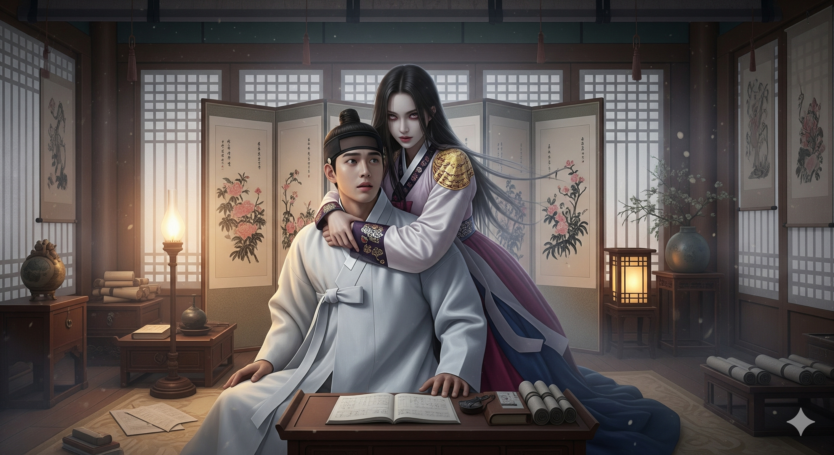 그날 밤, 월향은 평소보다 더욱 교태를 부리며 성준을 유혹했습니다. 그녀가 내오는 술잔에는 이전보다 더 진한 향기가 담겨 있었고, 그녀의 몸짓은 한시도 그를 가만두지 않았습니다. 그녀는 성준을 자신의 무릎에 눕히고는, “서방님의 정기는 참으로 달고 뜨거워, 저의 텅 빈 몸을 가득 채워주는 듯합니다.”라며 그의 귓가에 속삭였습니다. 성준은 노인의 말을 떠올리며, 역겨움을 참고 그녀가 원하는 대로 모든 것을 내어주었습니다. 그녀의 차가운 입술을 받아내고, 생명체의 온기라고는 느껴지지 않는 얼음장 같은 살결을 어루만졌습니다. 그녀가 그의 위에서 허리를 흔들 때마다, 자신의 생명이 한 움큼씩 빠져나가는 것이 느껴졌지만, 그는 오히려 더 격렬하게 그녀를 원하는 척 연기해야 했습니다. 드디어 월향이 만족스러운 신음을 길게 내뱉으며 그의 품속에서 깊은 잠에 빠져들었을 때, 성준은 지금이 기회임을 직감했습니다. 그는 조심스럽게 품속에서 부적을 꺼내, 잠든 그녀의 이마에 붙이려 손을 뻗었습니다.