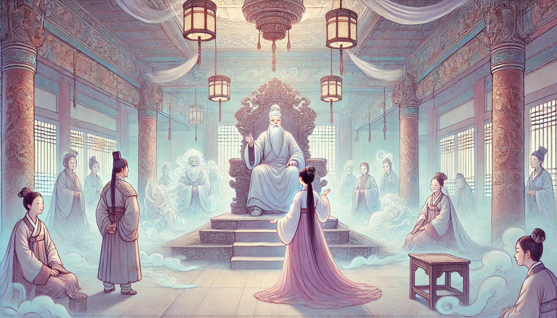 염라대왕은 높은 자리에 앉아 있었습니다. 얼굴은 엄숙했지만, 눈빛은 따뜻했습니다. 염라대왕 앞에는 거대한 책이 놓여 있었는데, 그것은 생사부라고 했습니다. 사람들의 생과 사, 그리고 업보가 모두 기록된 책이었습니다.