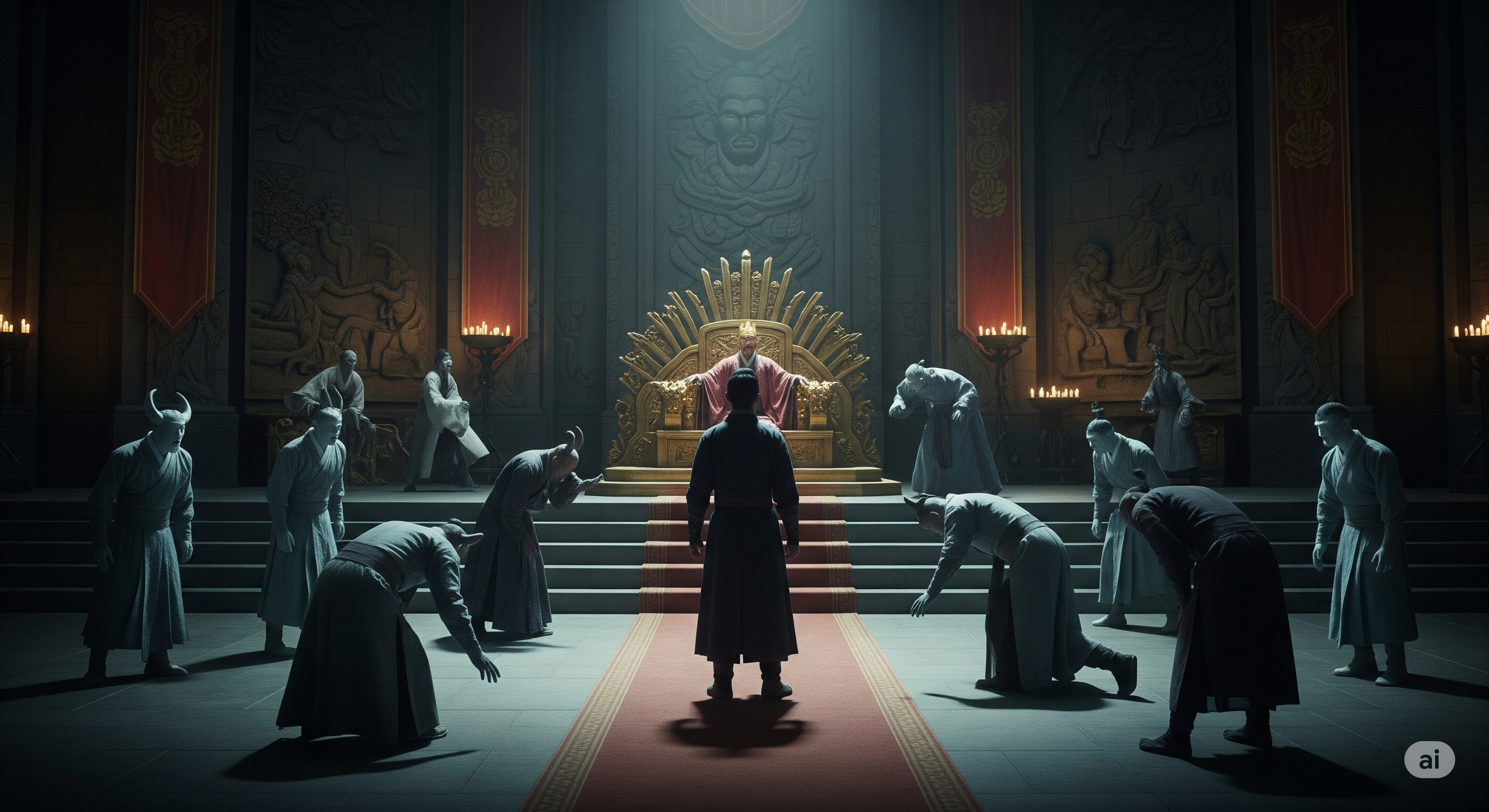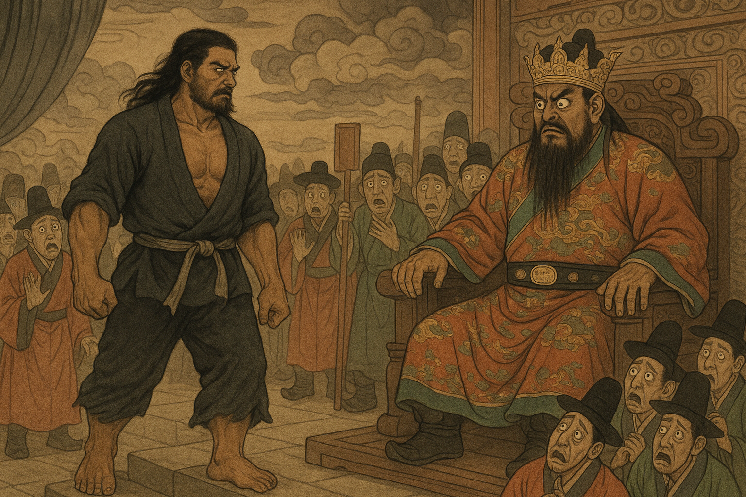 문지기들이 소리치는 순간, 궁전 안에서 엄청난 기운이 느껴졌습니다. 염라대왕이 직접 나온 것입니다.