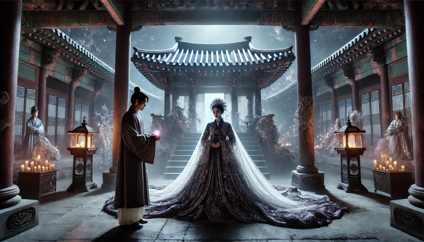 조선 중기, 한양 남산골에 이선우라는 가난한 선비가 살고 있었다. 그는 비록 가진 것은 없었으나, 성품이 강직하고 어질기로 주위에 소문이 자자했다. 일찍이 부모님을 여의고 혈혈단신으로 지내며, 오직 학문에만 매진하는 고독한 삶이었다. 그해, 나라에는 끔찍한 역병이 돌아 수많은 사람들이 목숨을 잃었다. 길거리에는 시체가 나뒹굴고, 곡소리가 끊이지 않았다. 이선우 역시 며칠을 굶어 기력이 쇠진한 상태였다. 그러던 어느 날, 그는 자신의 마지막 남은 쌀 한 줌으로 죽을 쑤어 길을 나섰다. 굶주림에 지쳐 쓰러져 있는 노인에게 마지막 식사라도 대접하기 위해서였다. 그가 막 노인에게 죽을 먹이려던 순간, 별안간 그의 앞에 그림자가 드리워졌다. 고개를 들자, 관복을 입었으나 얼굴이 백지장처럼 하얗고 눈빛이 없는 기이한 사내 둘이 그를 내려다보고 있었다. "네가 이선우더냐." 그 목소리는 마치 깊은 동굴에서 울리는 듯, 차갑고 생기가 없었다. 이선우가 대답할 틈도 없이, 사내들은 그의 양팔을 붙잡았다. 순식간에 그의 주변 풍경이 회오리치듯 변하기 시작했다. 익숙한 한양의 거리가 사라지고, 안개 자욱한 낯선 길 위에 서게 되었다. 길의 끝에는 거대하고 위압적인 궁궐이 서 있었다. 궁궐의 현판에는 '염라전(閻羅殿)'이라는 세 글자가 선명하게 새겨져 있었다. 저승이었다. 그는 산 채로 저승에 끌려온 것이다. 그가 정신을 차릴 새도 없이, 사내들은 그를 거대한 전각 안으로 끌고 갔다. 전각의 가장 높은 옥좌에는, 집채만 한 거구의 사내가 앉아 있었다. 머리에는 면류관을 쓰고, 온몸에서는 감히 마주할 수 없는 위엄과 냉기가 뿜어져 나왔다. 염라대왕이었다. 염라대왕이 지축을 울리는 목소리로 입을 열었다. "네가 바로 이선우렷다. 굶주림에 죽어가는 와중에도, 자신의 마지막 양식을 타인에게 베푸는 네 선한 마음을 내가 보았노라." 이선우는 땅에 엎드려 벌벌 떨면서도, 간신히 입을 열었다. "대왕이시여, 소인에게 어찌 이런 기이한 일을 행하시나이까. 부디 저를 이승으로 돌려보내 주시옵소서." 하지만 염라대왕은 그의 애원을 비웃듯, 상상조차 할 수 없는 말을 내뱉었다. "네 선행에 대한 상을 내리고자 한다. 내 너를 나의 사위로 삼겠노라. 내 외동딸과 혼인하여, 부귀영화를 누리게 해주겠다." "예? 사… 사위라니요! 소인은 산 자이옵고, 공주님은 저승의 분이신데 어찌 부부의 연을 맺는단 말입니까!" "내 결정에 토를 달지 마라. 이는 네게 내리는 상이자, 거스를 수 없는 나의 명령이다." 염라대왕의 말은 법이고, 그의 의지는 운명이었다. 이선우는 아무런 저항도 할 수 없었다. 그날로 저승의 궁궐에서는 기이한 혼례가 치러졌다. 하객은 모두 창백한 얼굴의 혼령들이었고, 풍악 소리 대신 구슬픈 바람 소리만이 궁궐을 맴돌았다. 이선우는 혼이 나간 사람처럼, 자신이 지금 무엇을 하고 있는지도 모른 채 예를 올렸다. 그렇게 그는, 자신의 의지와는 상관없이, 하룻밤에 저승의 부마가 되었다.