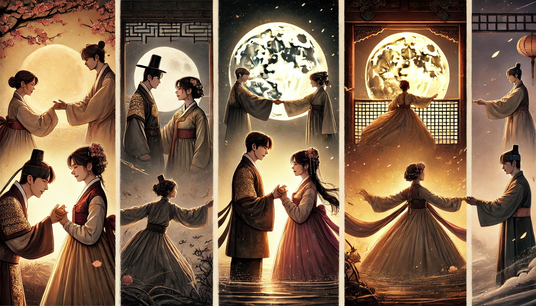 그들의 얼굴이 가까워졌다. 달빛이 두 사람을 비추는 가운데, 과거의 기억과 현재의 감정이 뒤섞였다. 도혁의 숨결이 수연의 뺨을 간질였고, 그녀의 향기가 그를 감쌌다. 그것은 어딘가 익숙한, 매화 향기였다.