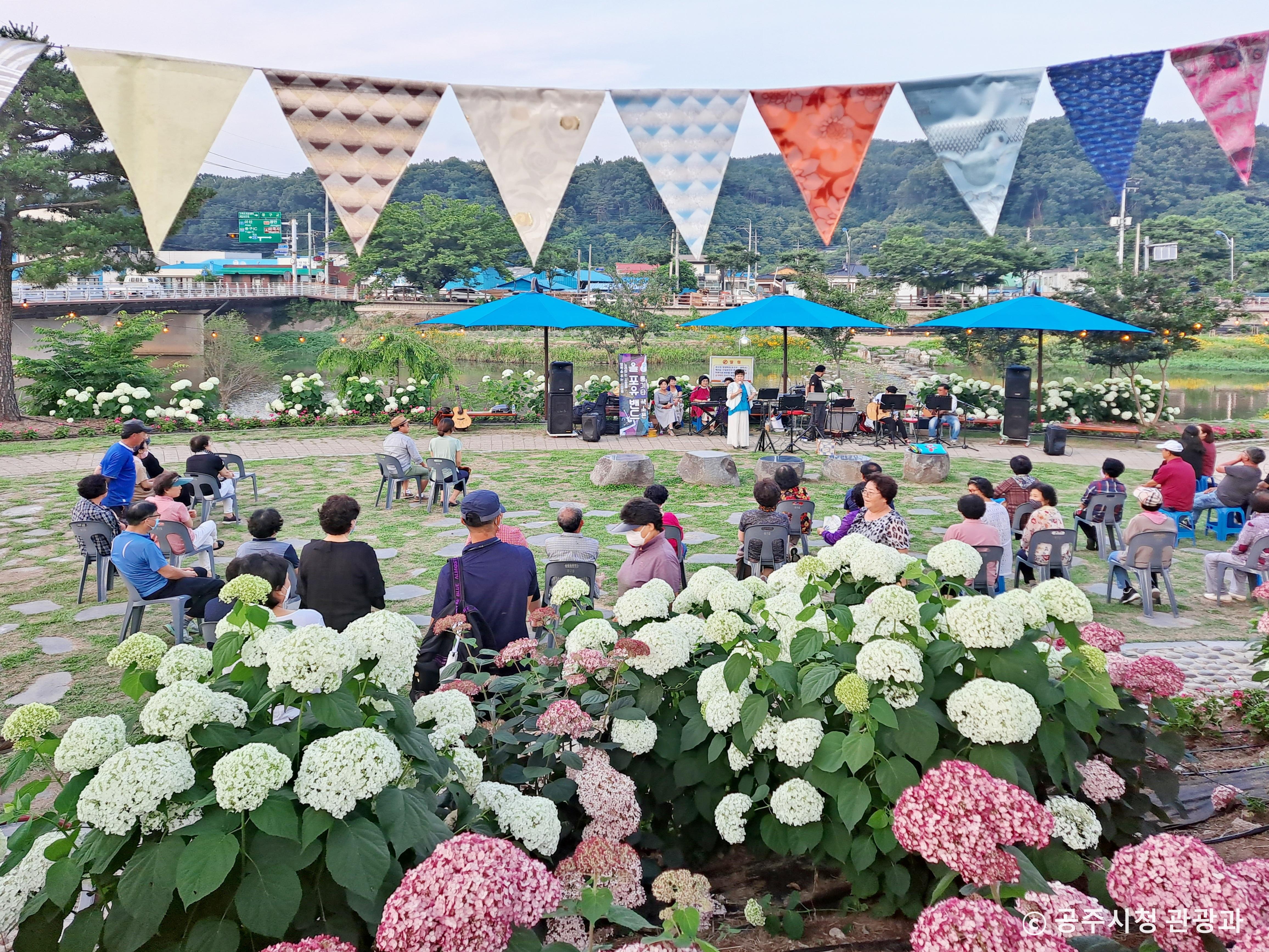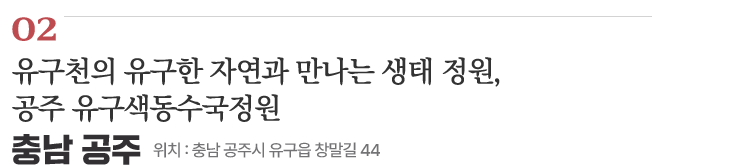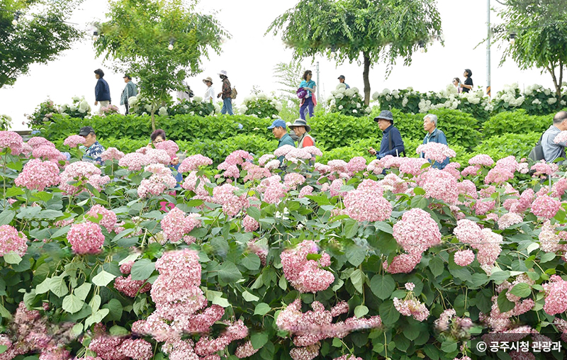 백제 시대의 유물과 유적이 살아 숨 쉬는 공주는 과거와 현재, 전통과 현대가 조화를 이루는 역사문화 도시로 유명하다. 요즘엔 공주시 북서쪽에 조성된 ‘유구 색동수국정원’ 덕분에 친환경 생태 정원으로도 많은 사람의 사랑을 받고 있다. 유구색동수국정원이 위치한 유구천은 공주시가 복원한 1급수 청정 하천이다. 총 4만 3천㎡ 면적의 유구천 수변공간에 에나멜수국, 목수국, 앤드리스서머, 핑크아나벨 등 약 20여 종 2만여 본의 수국을 심어 중부권 최대 수국단지로 거듭났다.