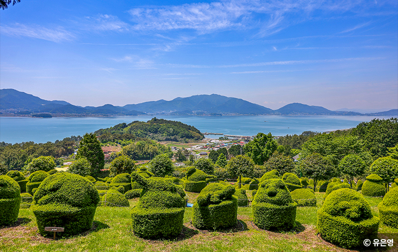 토피아랜드에서는 무려 600여 점의 토피어리 작품을 한자리에서 만날 수 있다. 공룡, 거북이, 오리 가족 등 귀여운 동물은 물론 뽀로로, 라바, 포비 같은 만화 캐릭터까지 다양하다. 금방이라도 칙칙폭폭 달려갈 것 같은 기다란 기차는 아이들이 환호하고, 거실 테이블과 소파 작품은 엄마들의 눈길을 붙잡는다. 아이도 어른도 활짝 웃으며 동심의 세계로 돌아간다. 초록의 정원을 걷다가 뒤돌아보면 쪽빛 바다가 그림처럼 펼쳐진다.