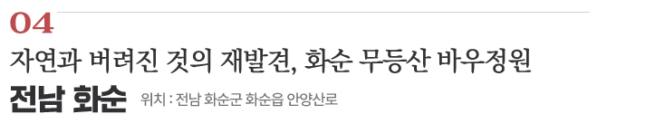 바우정원은 버려진 물건이 ‘임자’를 만나 재탄생한 업사이클링 정원이자, 은근과 끈기, 지붕과 산의 곡선을 곳곳에 담아낸 한국미 넘치는 정원이다. 화순의 또 다른 힐링코스는 만연저수지를 품은 동구리호수공원과 화순군립 최상준미술관이다. 고택문화체험 공간으로 변모한 양참사댁과 화순 4경으로 꼽히는 고인돌 유적까지 자연과 사람이 공존하는 화순으로 떠나보자.