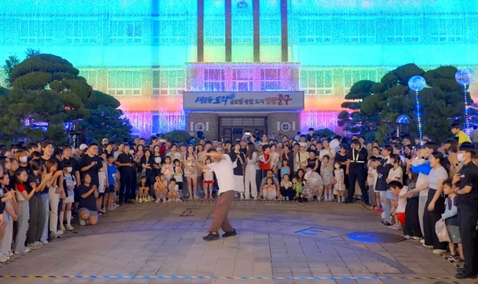 중구청 외벽에 Twinkle pro, 마퀴라이트 등으로 전년도보다 업그레이드된 라이팅 쇼, 근대건축물의 예술성을 그대로 전달