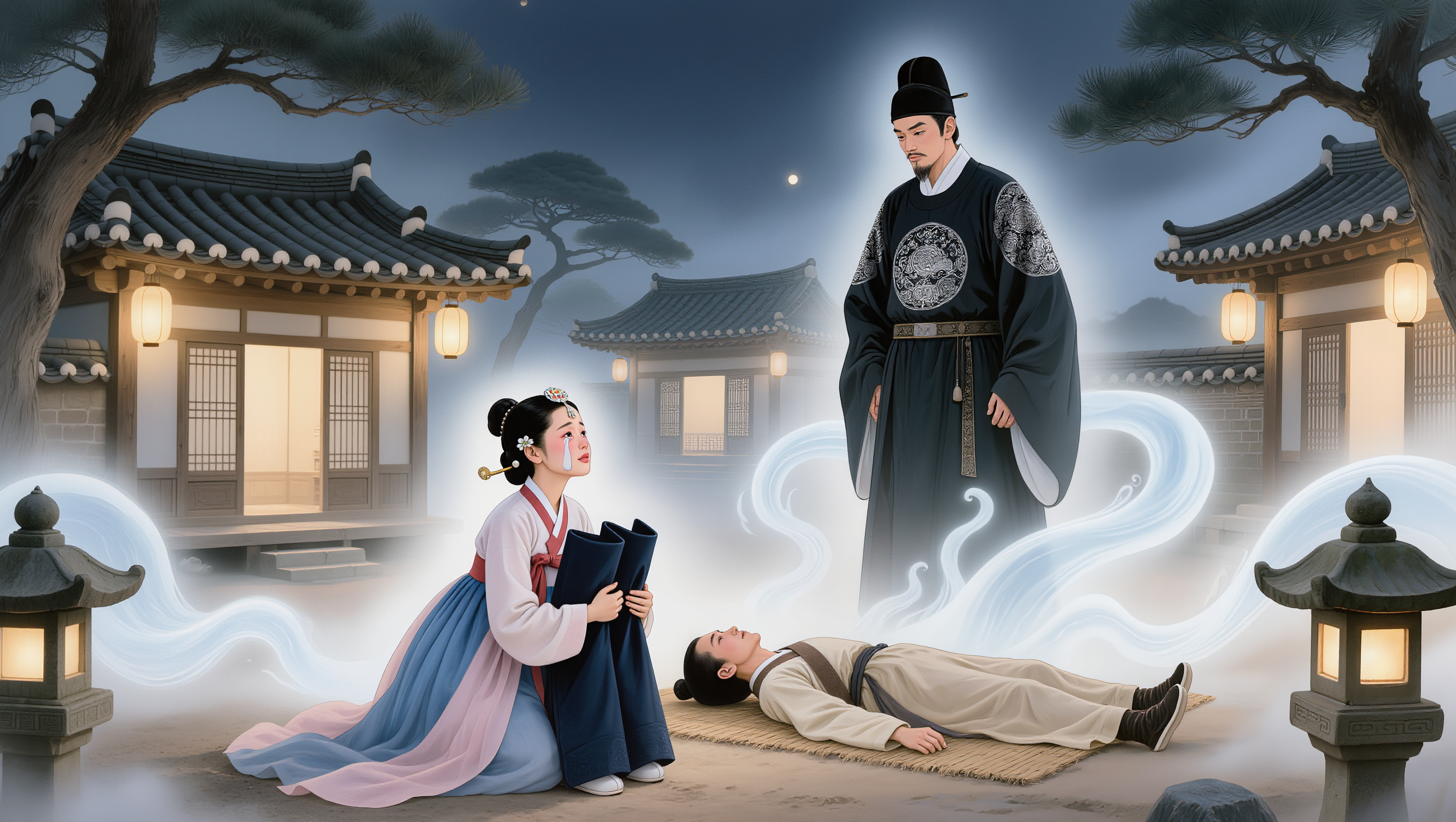 그 목소리는 귀로 들리는 것이 아니라 머릿속에서 바로 울리는 듯했습니다. 그 순간, 놀랍게도 며칠째 꼼짝 못 하던 선비의 몸에서 희뿌연 그림자 같은 것이 일어나 앉으려 했습니다. 선비의 영혼이 육신을 빠져나가려는 찰나였습니다.