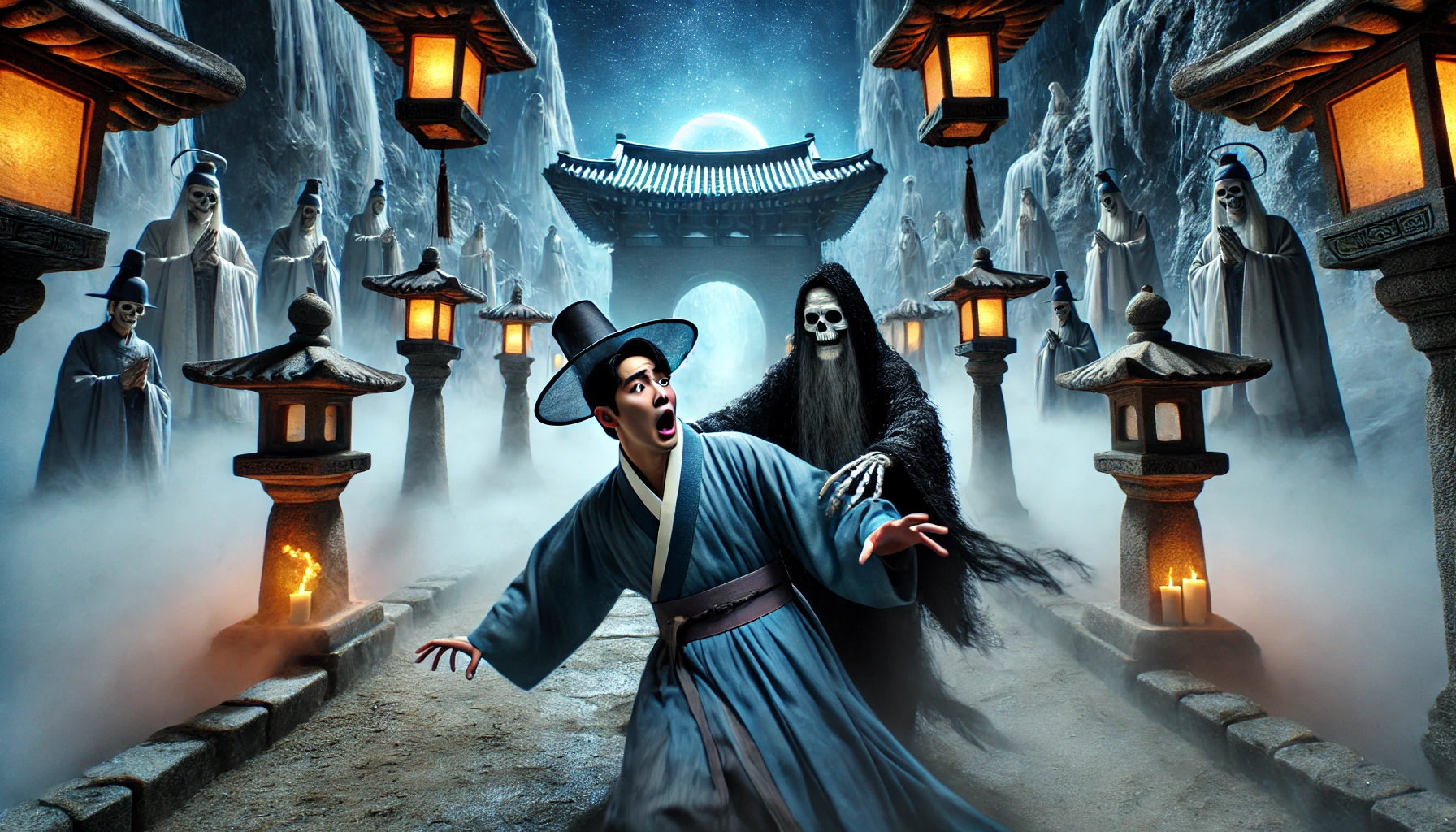 김서방이 저승사자에게 이끌려 집을 나서는 순간, 익숙했던 세상의 모든 것이 순식간에 빛을 잃고 아득한 안갯속으로 사라졌습니다. 방금 전까지 구수한 된장찌개 냄새와 흙냄새가 가득했던 공간은 온데간데없고, 사방은 온통 생기라곤 찾아볼 수 없는 잿빛으로 가득했습니다. 해와 달, 별조차 없는 기이한 하늘 아래, 끝도 없이 펼쳐진 황량한 벌판이 눈앞에 나타났습니다. 발밑의 흙은 부드럽지도, 단단하지도 않은 이상한 감각이었고, 한 걸음 한 걸음 내디딜 때마다 먼지 하나 일지 않았습니다. 이따금씩 불어오는 바람은 살을 에는 듯 차가웠지만, 이상하게도 소름이 돋지는 않았습니다. 이미 살아있는 자의 감각이 아니었기 때문일까요. 김서방은 넋이 나간 사람처럼 저승사자의 뒤를 따를 수밖에 없었습니다. 그의 곁에는 자신처럼 저승사자에게 이끌려오는 수많은 영혼들이 마치 강물처럼 흐르고 있었습니다. 하얀 소복을 입은 노인, 관복을 입은 채 망연자실한 표정의 관리, 그리고 갓난아기를 품에 안고 하염없이 눈물만 흘리는 젊은 어미까지. 그들의 모습은 각기 달랐지만, 얼굴에 서린 깊은 슬픔과 미련, 그리고 체념의 빛은 모두 똑같았습니다. 아무도 소리 내어 울거나 말을 하지 않았고, 그저 묵묵히 발걸음을 옮길 뿐이었습니다. 그 침묵의 행렬은 살아생전의 그 어떤 통곡 소리보다도 더 구슬프게 느껴졌습니다. 김서방은 문득 자신의 손을 내려다보았습니다. 밭일로 굳은살이 박이고 거칠었던 자신의 손이, 이제는 마치 허깨비처럼 반투명하게 비쳐 보였습니다. 그제야 그는 자신이 정말로 죽었다는 사실을, 다시는 아내와 아이들을 만질 수도, 안아줄 수도 없다는 사실을 뼈저리게 실감했습니다. 심장이 찢어지는 듯한 고통이 몰려왔지만, 이상하게도 눈물 한 방울 나오지 않았습니다. 그는 고개를 들어 앞서가는 저승사자의 등을 바라보았습니다. 감정이라곤 한 올도 느껴지지 않는 그 뒷모습을 보며, 김서방은 필사적으로 자신의 삶을 되돌아보기 시작했습니다. '내가 무슨 큰 죄를 지었던가? 남의 것을 탐한 적도 없고, 이웃에게 해코지를 한 적도 없는데. 그저 내 가족의 배를 곯지 않게 하려고, 남들보다 조금 더 부지런히 땀을 흘렸을 뿐인데. 어찌하여 나란 말인가.' 억울함과 슬픔이 뒤섞인 감정이 소용돌이쳤습니다. 아내의 얼굴이 떠올랐습니다. 고된 시집살이에도 늘 미소를 잃지 않았던 아내. 자신이 주는 생활비가 턱없이 부족했을 텐데도, 단 한 번 불평하지 않고 꿋꿋하게 살림을 꾸려나갔던 현명한 아내였습니다. 아이들의 얼굴도 눈앞에 아른거렸습니다. 아비의 주름진 손을 세상에서 가장 큰 손이라며 좋아했던 아들, 아비가 들려주는 옛날이야기를 들으며 잠드는 것을 가장 큰 행복으로 여겼던 딸. 이제 막 아비의 사랑을 듬뿍 받으며 자라나야 할 아이들이 졸지에 아비 없는 설움을 겪게 될 것을 생각하니, 차라리 자신의 영혼이 그대로 소멸해 버렸으면 좋겠다는 생각까지 들었습니다. 얼마나 걸었을까. 끝없이 이어질 것만 같던 잿빛 황야의 저편으로, 무언가 거대한 형체가 모습을 드러내기 시작했습니다. 그것은 거대한 성문과도 같았는데, 성벽은 하늘을 찌를 듯이 높았고 그 빛깔은 마치 핏물이 마르고 굳어버린 듯 검붉은 색을 띠고 있었습니다. 성문 위에는 기이한 글씨로 '풍도(酆都)'라는 현판이 걸려 있었습니다. 저곳이 바로 모든 망자가 거쳐 가야 하는 저승의 입구, 풍도성이었습니다. 그 압도적인 위용 앞에 서자, 수많은 영혼들 사이에서 나지막한 탄식과 흐느낌이 새어 나왔습니다. 김서방 역시 저 문을 넘어서면 다시는 이승으로 돌아올 수 없다는 것을 직감적으로 깨달았습니다. 바로 그 순간, 그의 곁을 스쳐 지나가던 한 저승사자가 앞서가던 저승사자에게 말을 거는 소리가 들렸습니다. "여보게, 자네가 데려온 저 영혼, 충주 땅의 김 아무개 맞나?" "그렇다만, 무슨 일인가?" "방금 명부 담당 판관에게서 전갈이 왔는데, 명부에 착오가 있었다는군. 오늘 데려와야 할 영혼은 충주 김 아무개가 아니라, 한양에 사는 동명이인 김 아무개였다고 하네. 생년월일이 같아 그만 실수를 한 모양이야." 그 말을 듣는 순간, 김서방의 발걸음이 우뚝 멈춰 섰습니다. 자신의 귀를 의심하며 고개를 돌리자, 두 명의 저승사자가 난처한 표정으로 서로를 마주 보고 있었습니다.