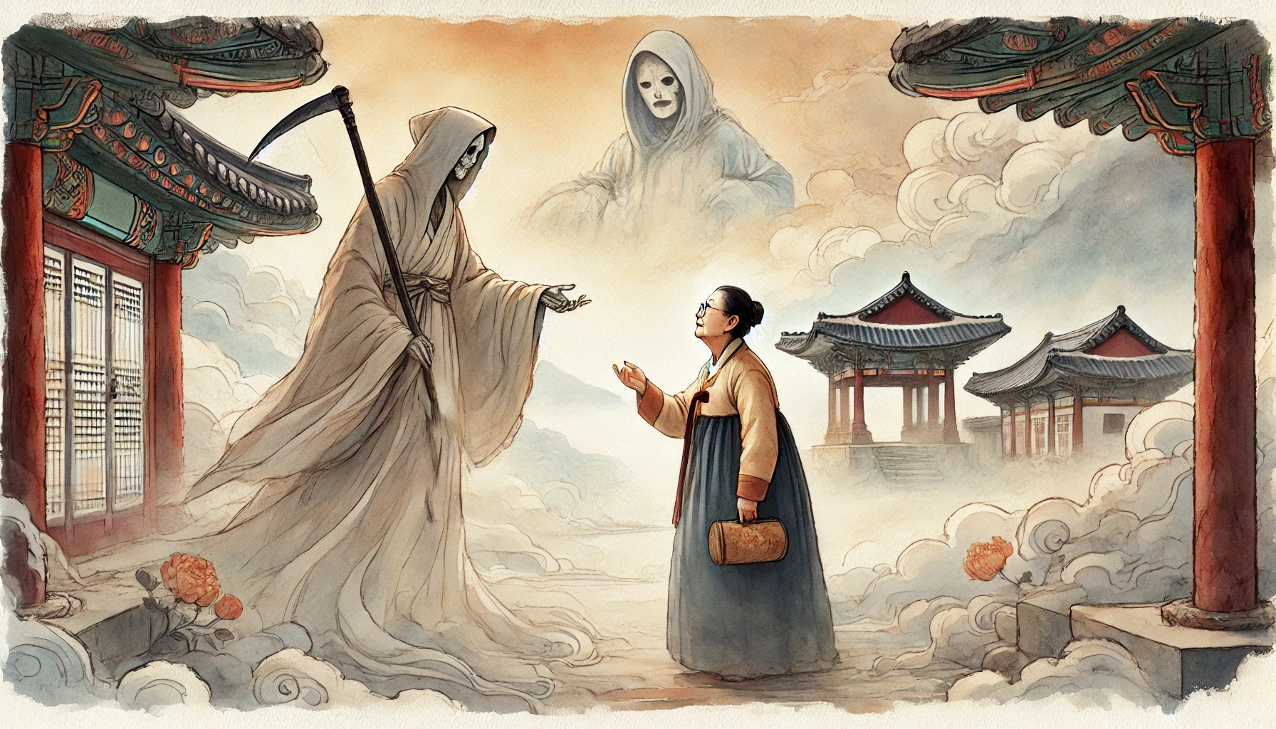 할머니는 믿을 수가 없었습니다. "예? 수명을 십 년이나요? 그런데 그게 가능한 일입니까?" 저승사자가 대답했어요. "보통은 불가능하오. 저승의 법도가 엄하거든. 하지만 할머니처럼 특별한 경우에는 예외가 있소. 대왕님께서 직접 생사부生死簿에서 할머니 이름을 지우시고, 십 년 뒤로 다시 쓰셨소."