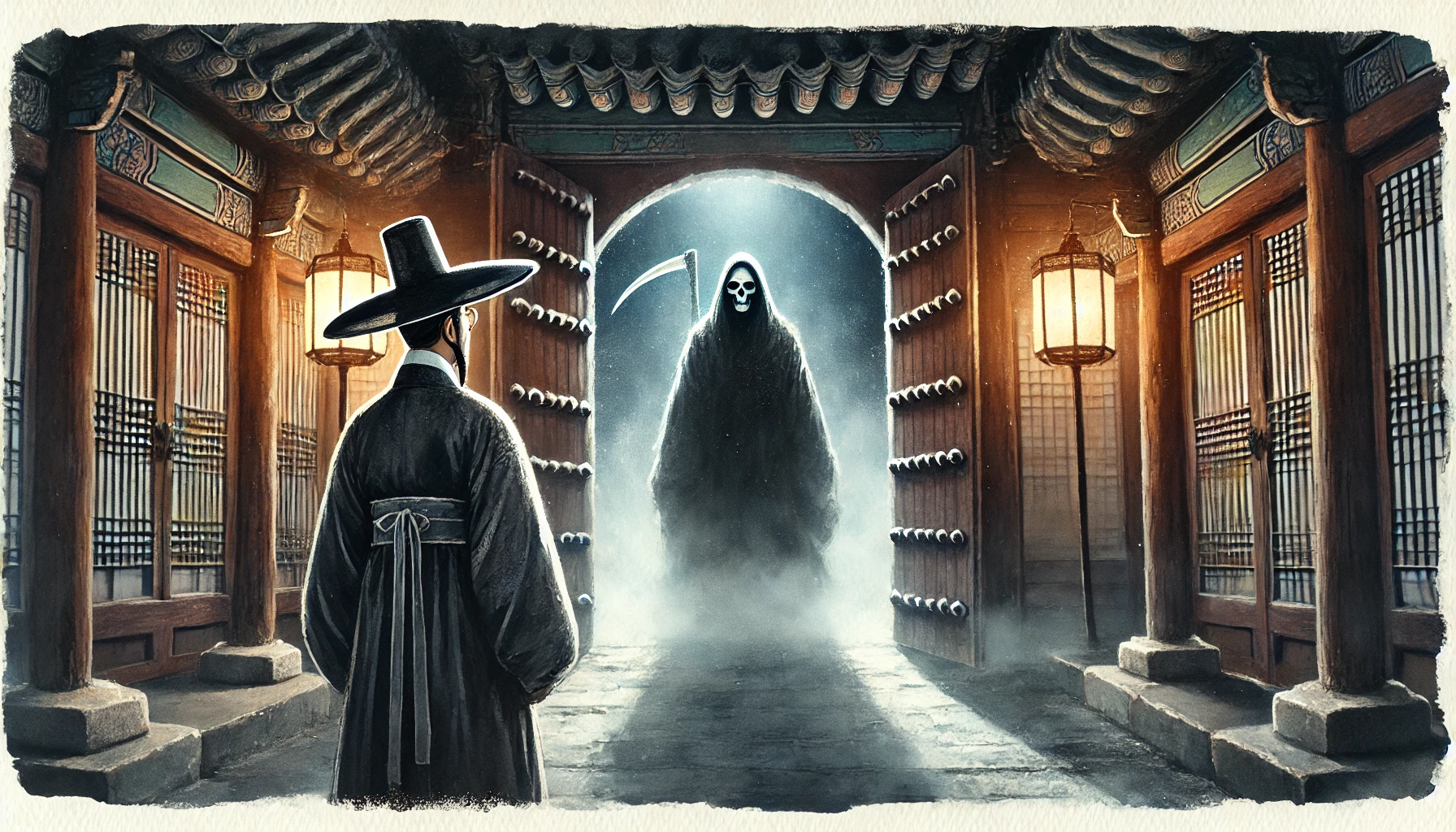 김 대감은 뒤도 안 돌아보고 방문을 박차고 나갑니다. 신발도 짝짝이로 신고, 버선발로 마당을 가로질러 어둠 속으로 냅다 뛰기 시작합니다. 뒤에서 저승사자가 서늘한 미소를 지으며 그 뒷모습을 바라보고 있는 줄도 모르고 말입니다. 과연 김 대감은 저승사자의 손바닥을 벗어날 수 있을까요? 아니면 이것 또한 저승사자의 잔인한 놀이일까요?