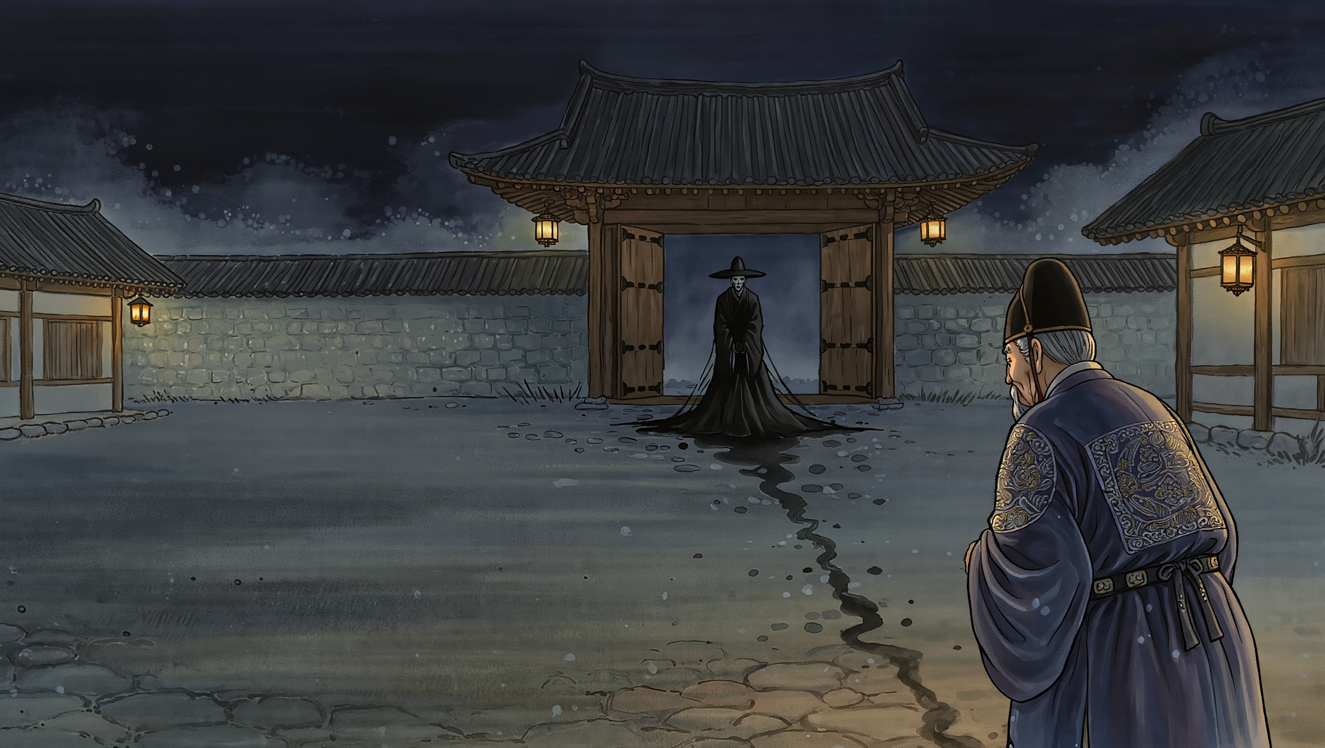 대답 대신, 잠겨 있던 문고리가 스르르 돌아갑니다. 안에서 걸쇠를 걸어 잠갔는데도, 마치 누가 밖에서 쇠를 녹이기라도 한 듯 문이 소리 없이 스르륵 열리는 겁니다. 그리고 문턱을 넘어 들어오는 사내. 머리부터 발끝까지 칠흑 같은 검은 도포를 입었고, 머리에는 갓을 썼는데 그 챙이 넓어 얼굴이 잘 보이지 않습니다. 하지만 그 갓 아래로 뿜어져 나오는 두 눈... 그 눈빛이 마치 깊은 우물 속에 빠진 듯 시퍼렇고 차가워서, 마주치는 순간 김 대감의 심장이 멎을 뻔했습니다.