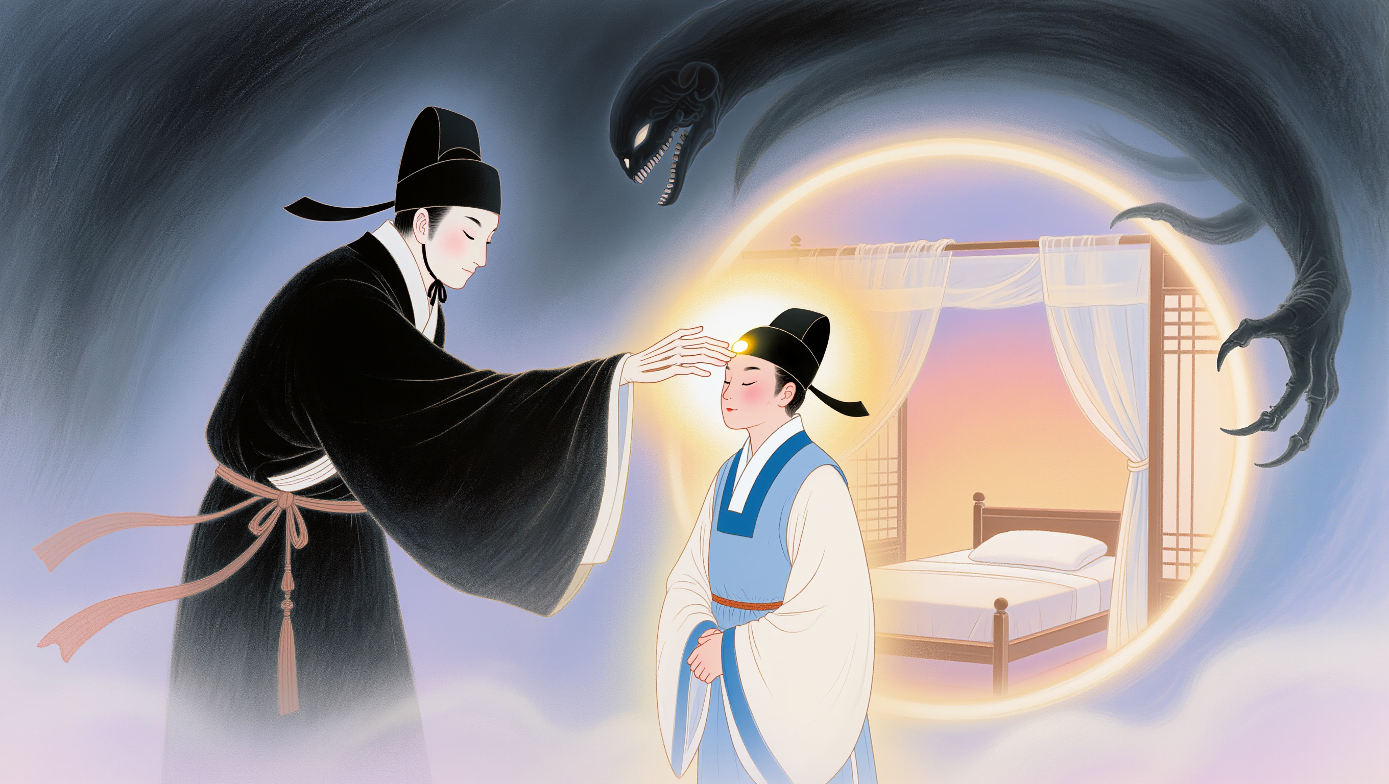 (Joseon-era folktales and unofficial histories, the afterlife) A mystical pastel artwork of the Grim Reaper gently touching the magistrate's forehead with one long finger, the magistrate's eyes closing as bright warm light begins to envelop his body, his form becoming translucent and starting to fade back toward the world of the living, the dark mist of the underworld receding, faint image of his bedroom appearing like a welcoming portal behind him, the reaper's expression now almost benevolent, sacred moment of covenant and return, beautiful contrast between dark supernatural realm and warm earthly light, ethereal hopeful atmosphere, soft luminous pastel tones, 16:9 aspect ratio, no text