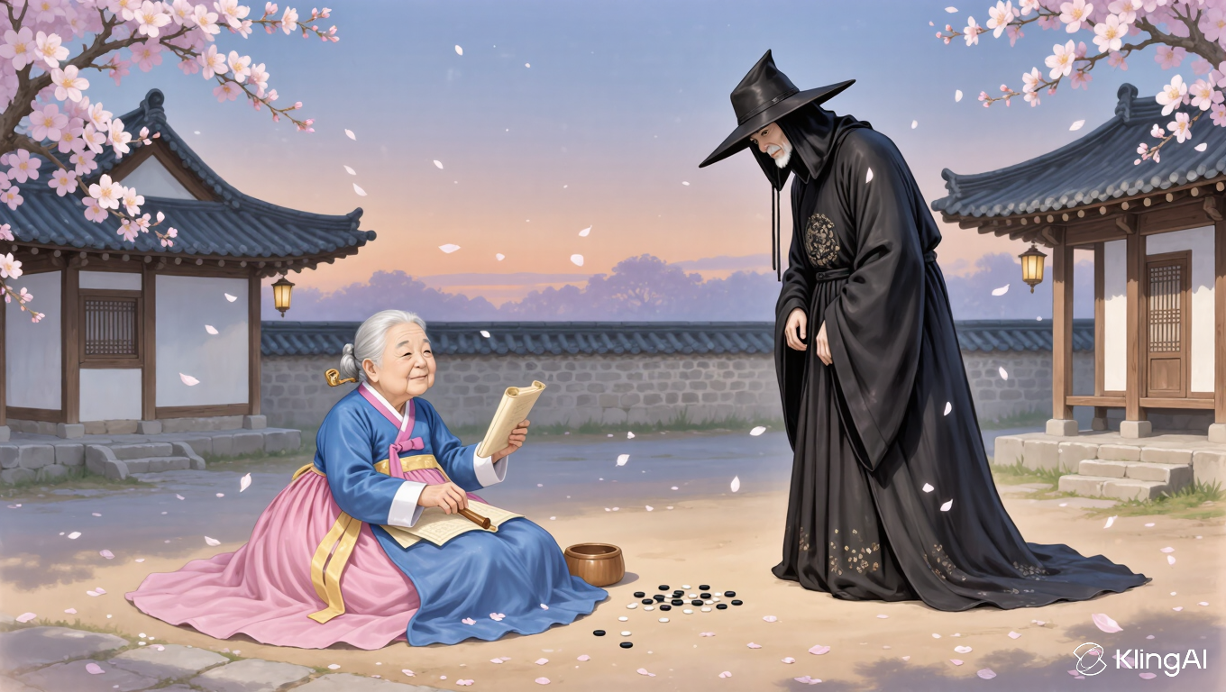 "할머니, 내 마지막 문제다." 저승사자가 심각한 표정을 지었습니다. "이건 정말 어려운 문제야." "어려워도 좋아. 말해봐." 할머니가 여전히 여유롭게 웃으셨습니다.