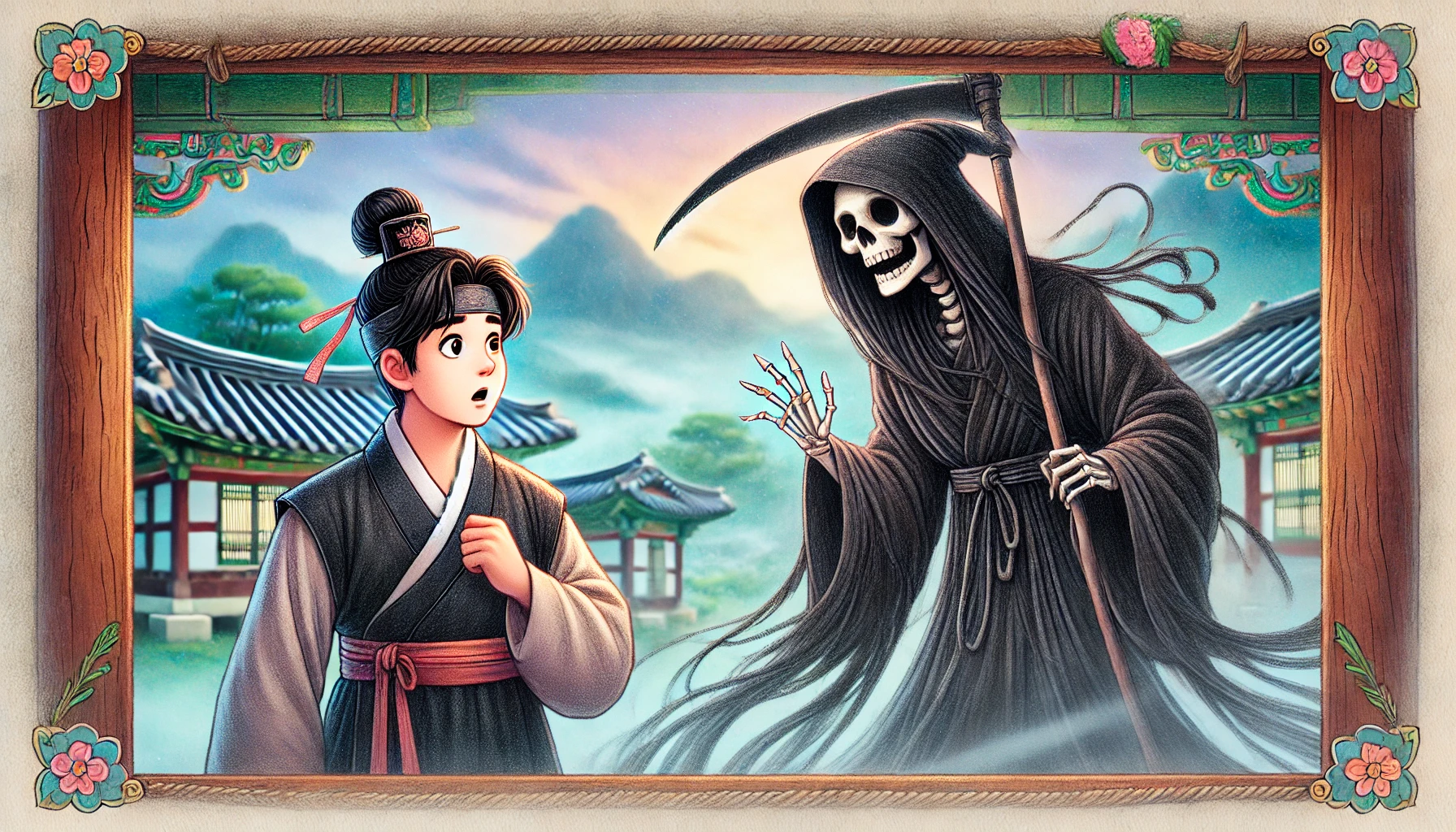 "네? 무슨 말씀이세요?" 학봉은 영문을 모르겠다는 표정으로 물었습니다. 저승사자는 한숨을 깊게 쉬며 설명하기 시작했습니다. "생사부를 보니 너의 원래 수명은 일흔여덟 살까지다. 지금 스물아홉이니까 아직 오십 년 가까이 더 살아야 하는 것이었어."