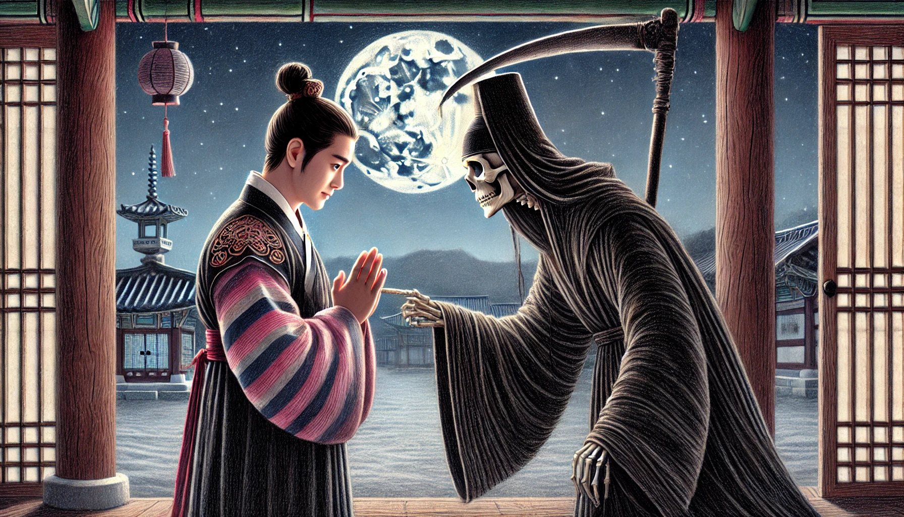 "네 덕행이 워낙 커서, 내가 함부로 네 목숨을 가져갈 수가 없다. 이런 경우에는 상부에 보고를 해야 한다." 저승사자가 절차적 고민을 드러냈습니다. 저승사자는 한참을 고민하더니 말했습니다. "잠깐만 기다려라. 내가 염라대왕께 이 상황을 보고해야겠다." 저승사자가 결정을 내렸습니다.