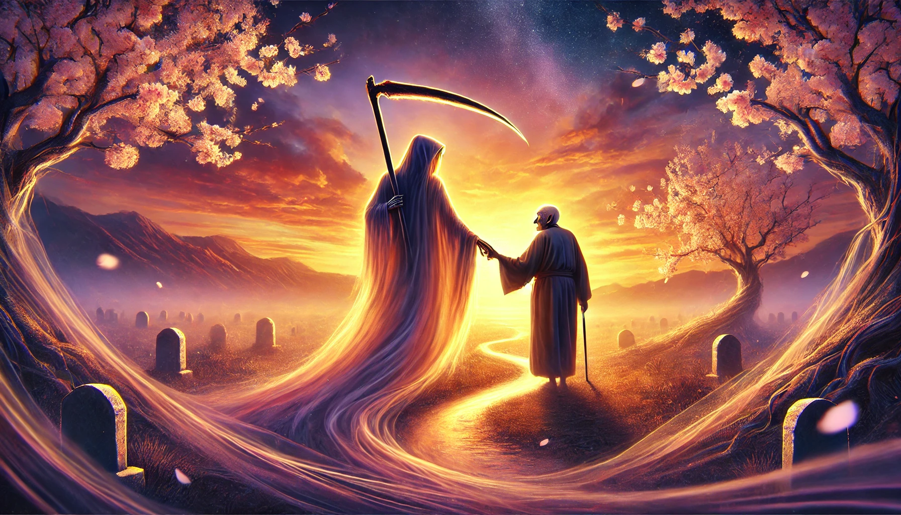 저승사자 여명은 할머니의 곁에 서서, 그녀의 모든 변화를 고요히 지켜보았습니다. 그의 검은 두루마기가 노을빛에 잠시 물드는 듯했습니다. 해가 완전히 사라지고, 하늘은 순식간에 짙은 남색으로 변해갔습니다. 그 순간, 여명은 순이 할머니에게로 손을 뻗었습니다. 그의 손길은 차갑지도, 뜨겁지도 않았습니다. 그저 존재할 뿐인, 순수한 이끌림이었습니다. 할머니는 주저 없이 그 손을 잡았습니다. 그녀의 손이 여명의 손에 닿는 순간, 할머니의 영혼은 마치 물방울이 물속으로 스며들듯, 여명의 존재 속으로 부드럽게 빨려 들어가는 듯했습니다.
