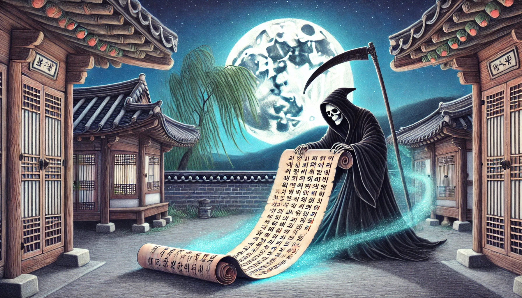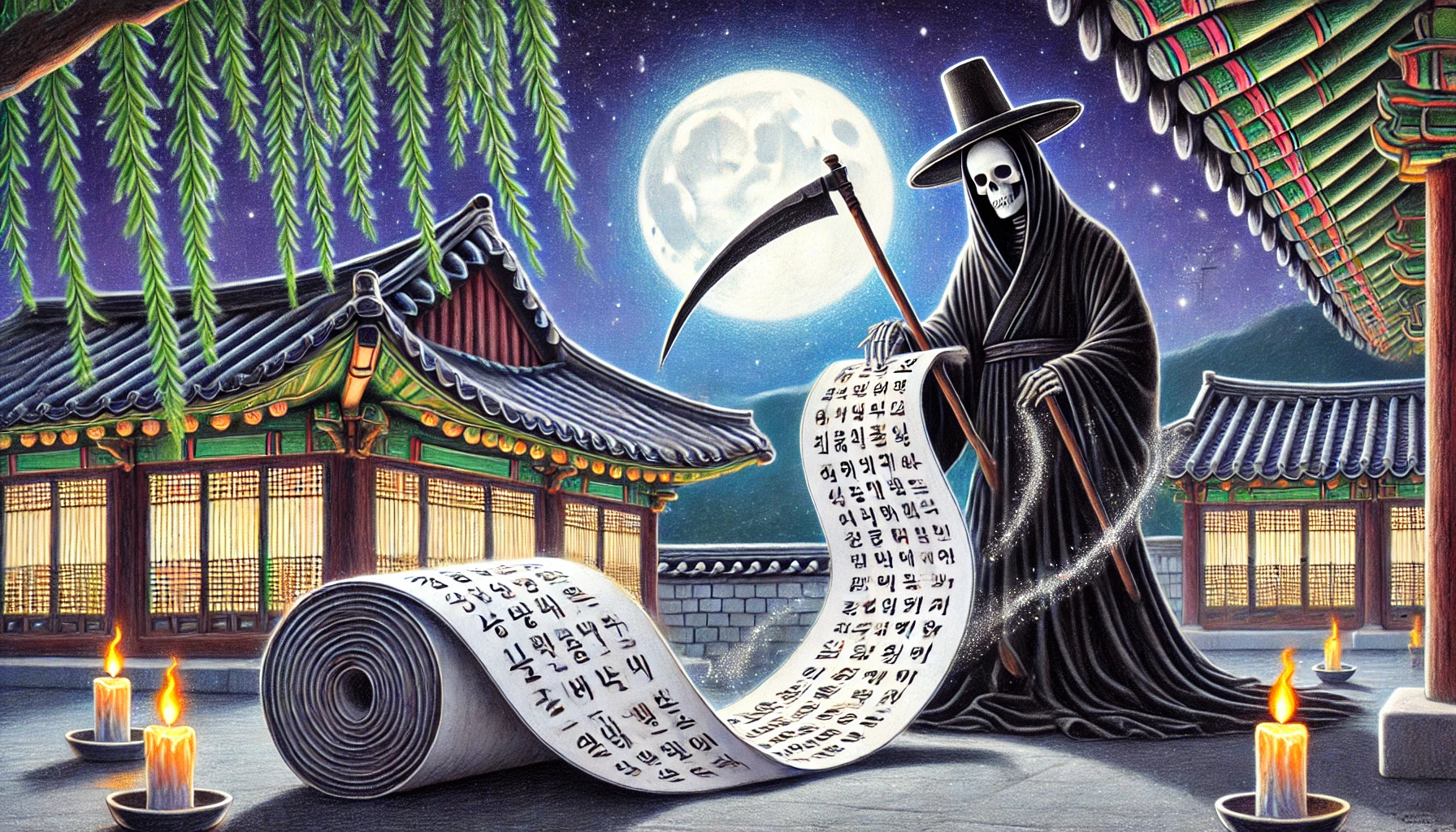 그런데 두루마리를 펼치는 순간, 이학사는 깜짝 놀랐습니다. 그 안에는 이상한 글씨로 사람들의 이름이 빼곡히 적혀 있었는데, 그 글씨가 마치 살아 움직이는 것처럼 보였기 때문입니다.