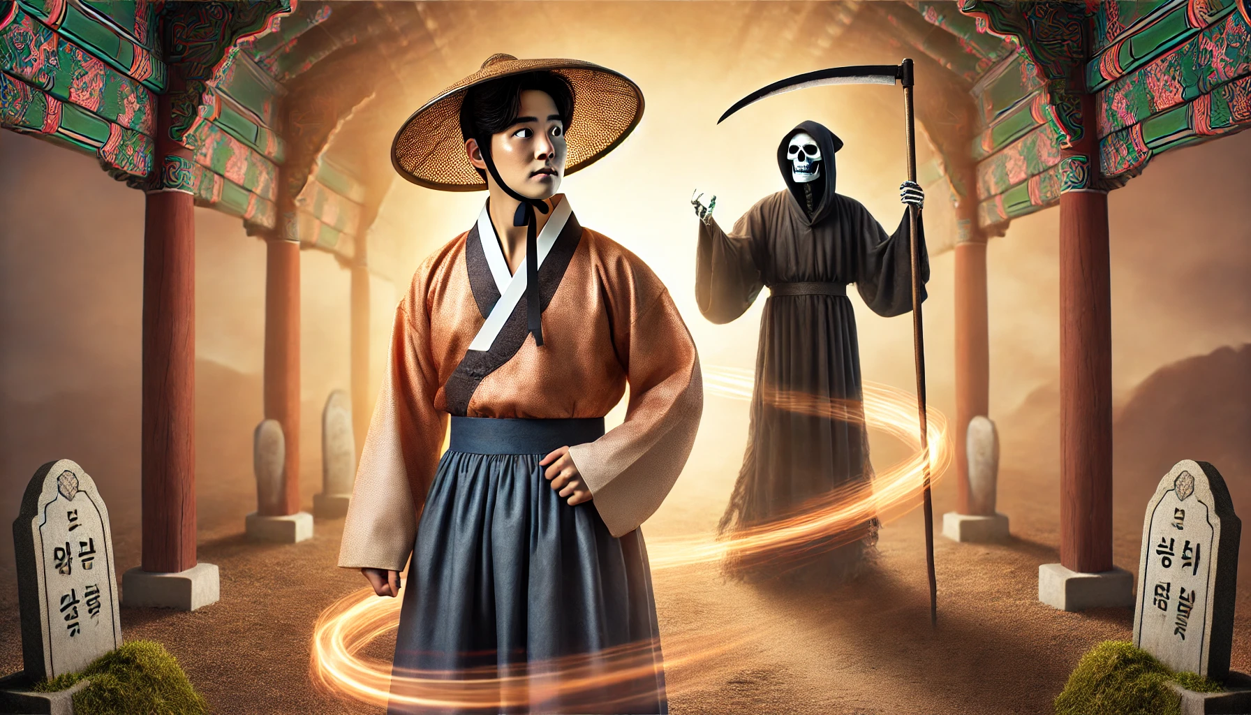 그때 갑자기 뒤에서 발자국 소리가 들렸습니다. 놀라서 돌아보니, 검은 도포를 입은 저승사자가 서 있었습니다.