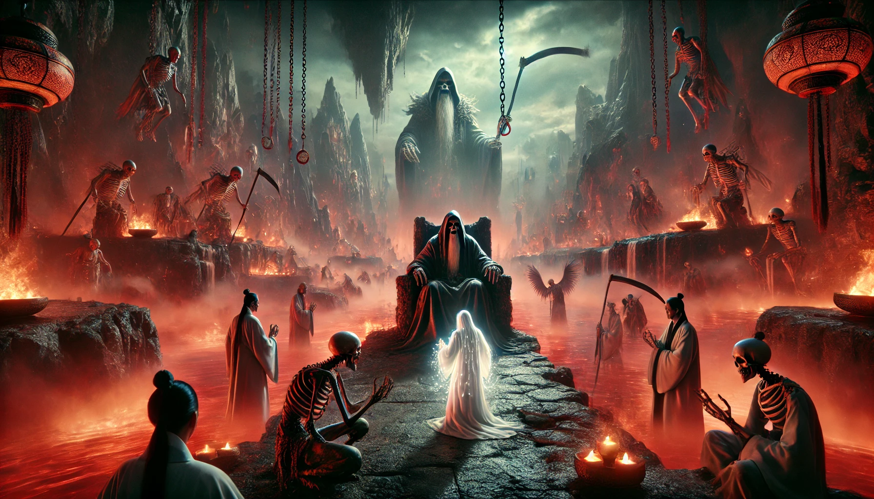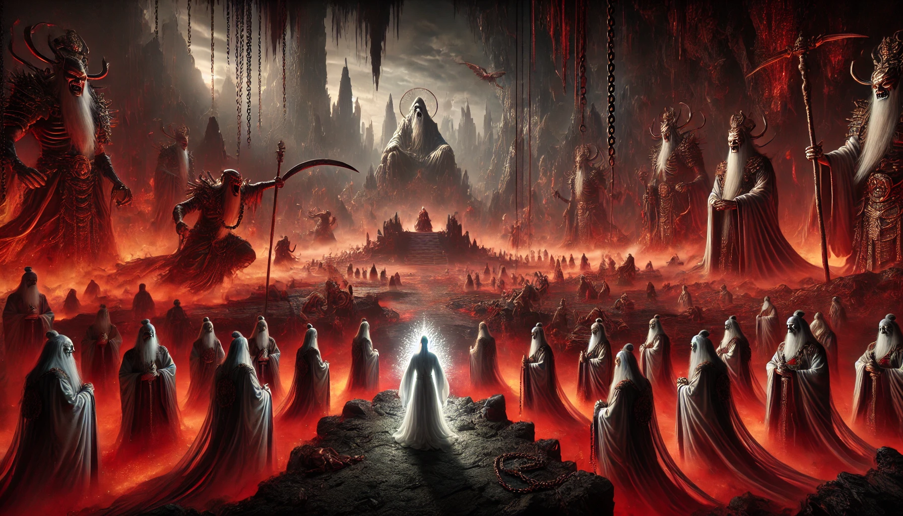이렇게 지옥의 여러 형벌장을 지나 마침내 도착한 곳은 거대한 궁전이었습니다. 그 궁전 한가운데 높은 옥좌가 있었고, 그 위에는 무시무시한 형상의 왕이 앉아 있었습니다. 바로 염라대왕이었습니다.