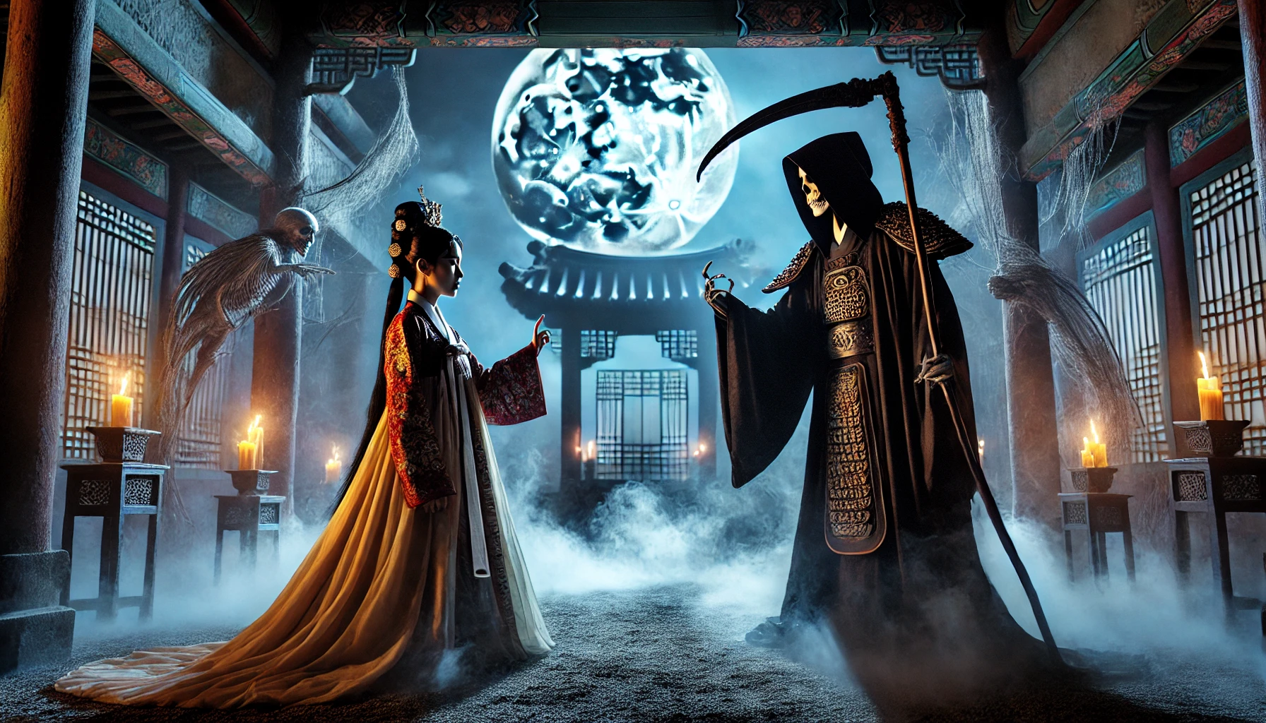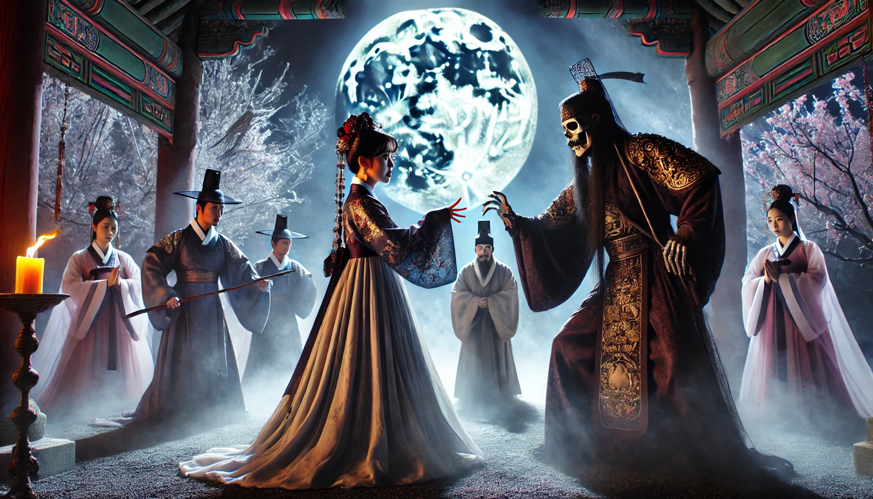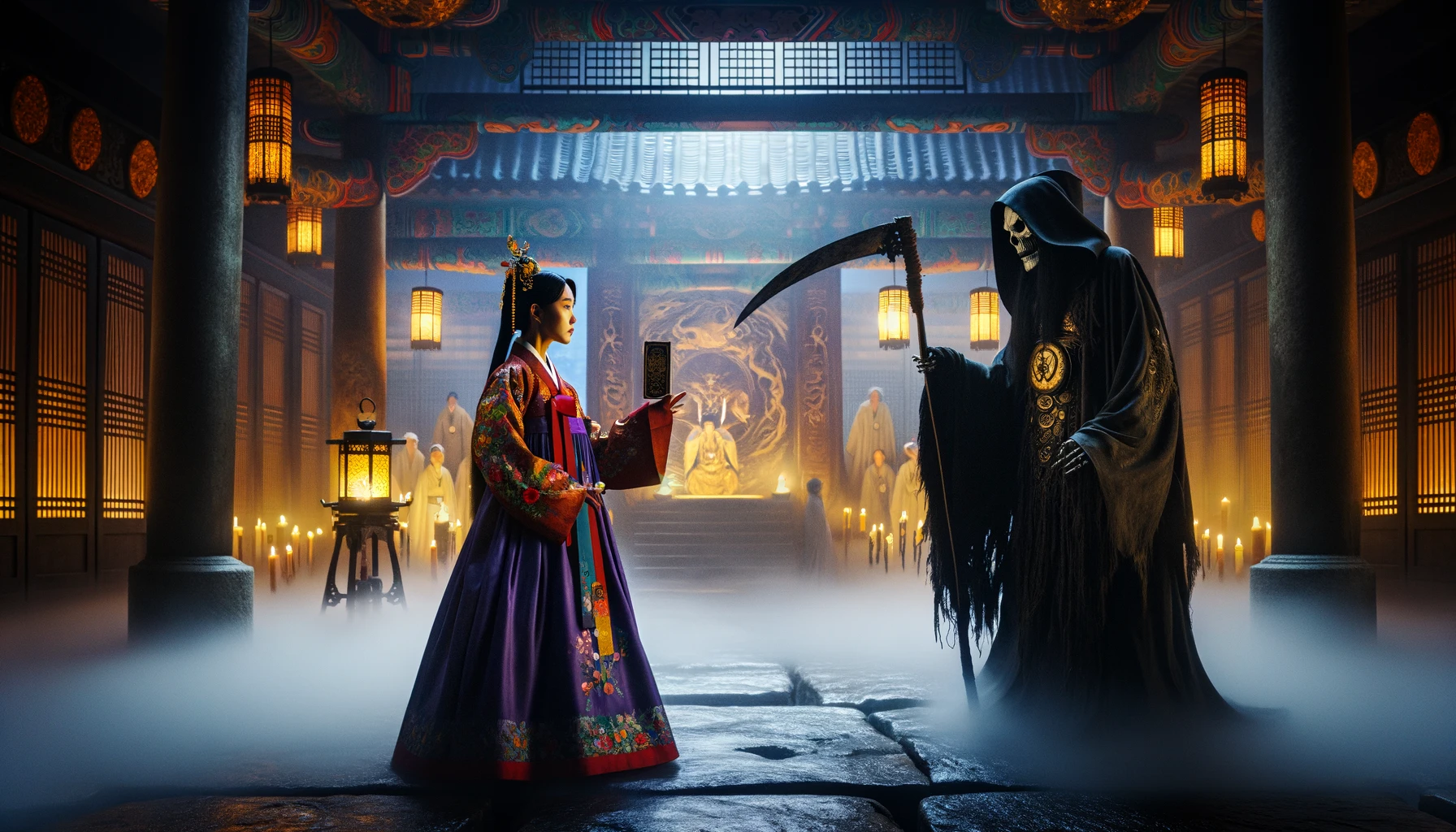 "인간 소령수, 네가 바로 저승의 법칙을 깨고 이곳까지 온 무녀로구나." 염라대왕의 목소리는 마치 천둥소리 같았다. 소령수는 무릎을 꿇고 깊이 절을 올렸다.