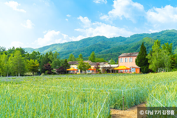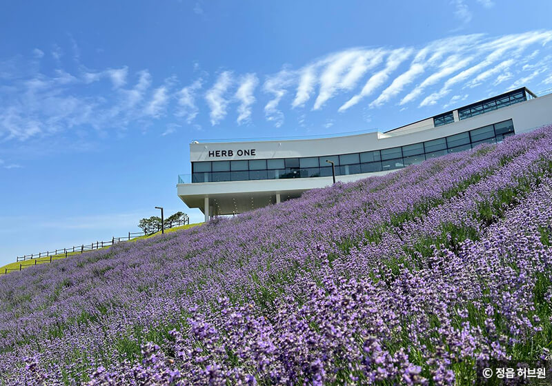 산자락에 위치해 있어 수려한 자연 풍경과 어우러져 더욱 아름다운 풍경을 감상할 수 있어요. 언덕 위에는 카페 허브원이 있어 잠시 휴식을 취하며 통유리를 통해 라벤더를 감상할 수 있습니다.