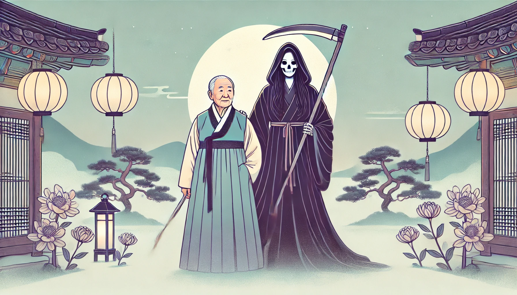 두 사람은 집을 나섰습니다. 달빛 아래, 노인과 저승사자는 나란히 걸었습니다. 노인의 걸음은 느렸지만, 저승사자는 재촉하지 않았습니다.