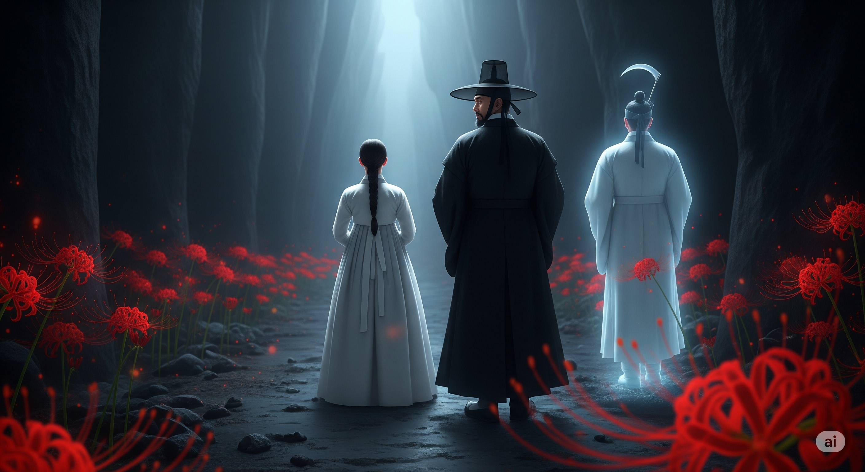 아내가 두려움에 떨며 고개를 들어보니, 검은 옷을 입고 갓을 쓴 키 큰 사내가 서 있었습니다. 얼굴은 창백하고 눈은 깊이를 알 수 없을 만큼 어두웠습니다. 바로 저승사자였습니다.