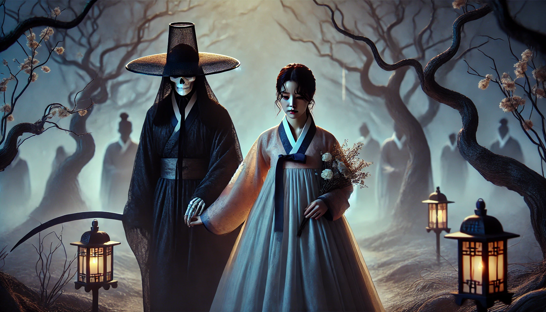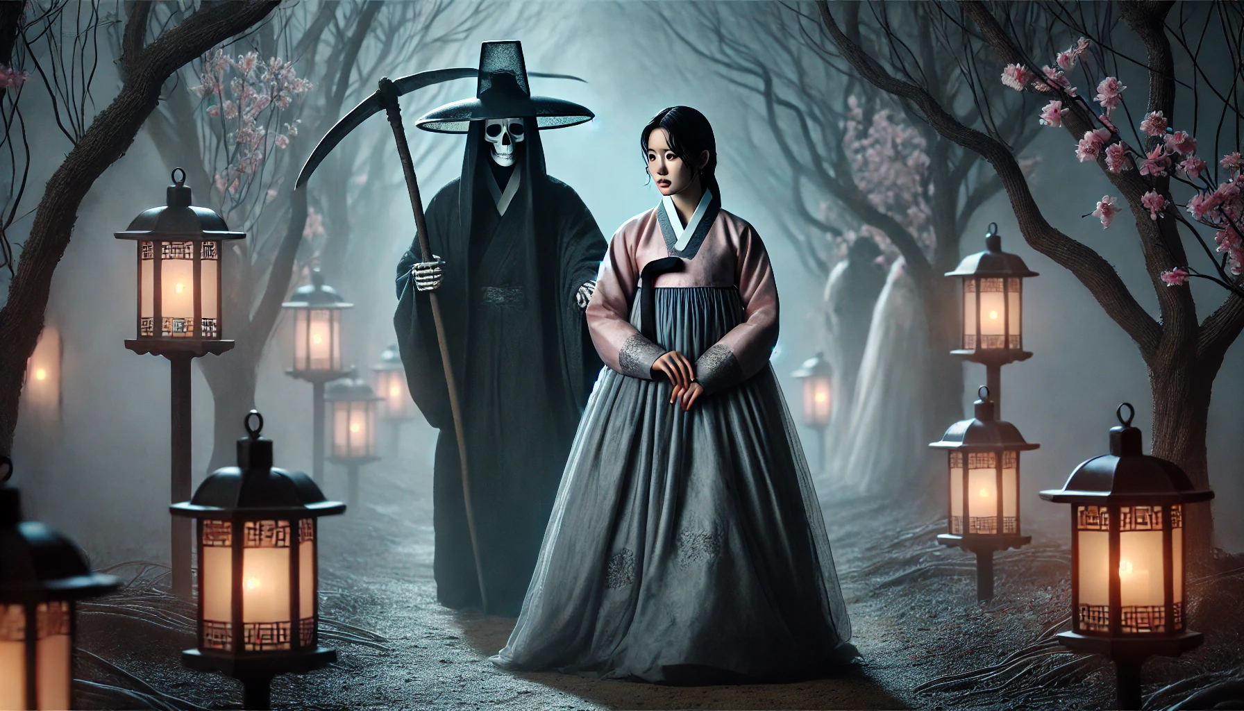 저승사자와 함께 길을 떠난 아내는 곧 현실 세계와는 전혀 다른 풍경을 마주하게 되었습니다. 하늘은 회색빛으로 덮여 있고, 땅은 메마르고 거칠었습니다. 차가운 바람이 뼛속까지 스며들었습니다.