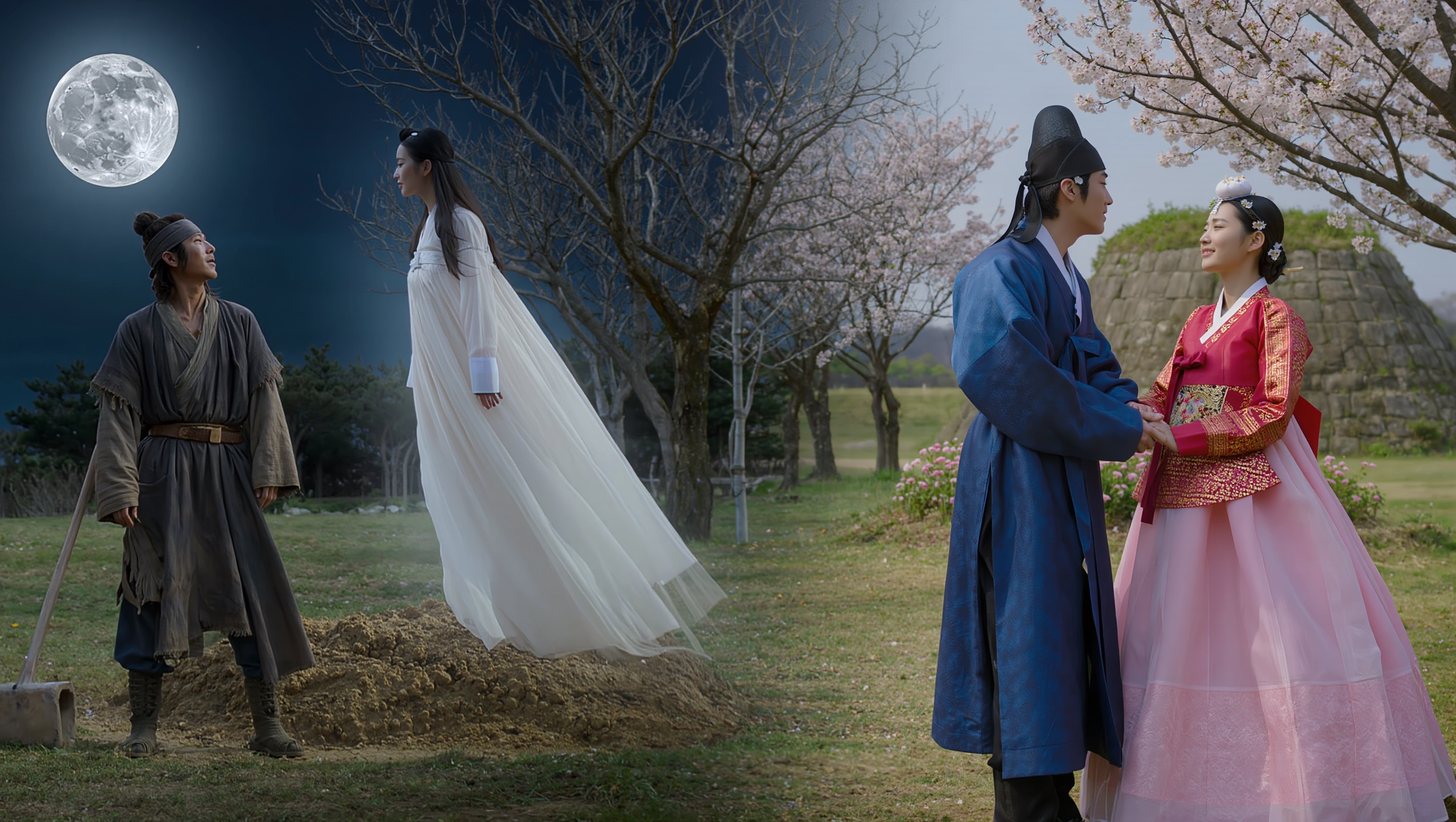 Split dramatic composition showing Joseon Dynasty gravedigger in worn hanbok encountering ethereal female ghost in flowing white hanbok with translucent glow under moonlight on left side, and same couple one year later as living humans in wedding ceremony hanbok joyfully holding hands in spring daylight on right side, ancient burial mound in background, mystical supernatural atmosphere transforming to warm happy ending, cinematic lighting, photorealistic Korean historical drama style, 16:9