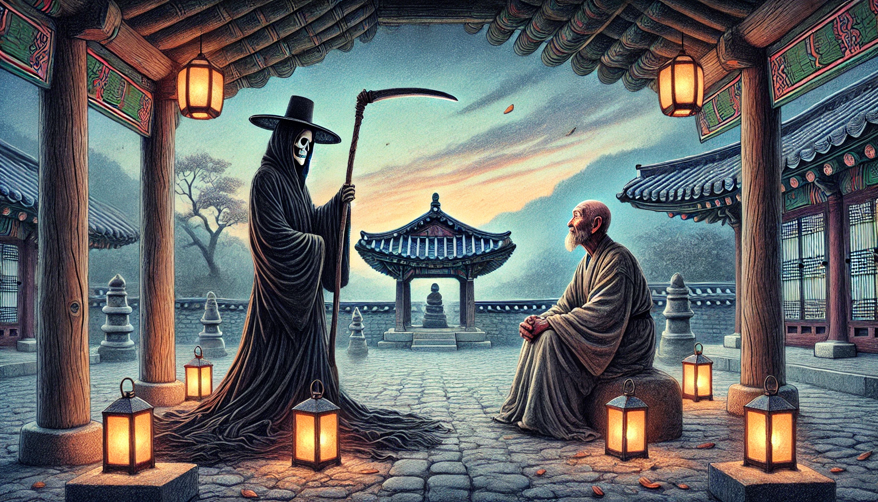 저승사자가 당황했다. "하지만 스님, 정해진 시간을 어길 수는 없습니다..."