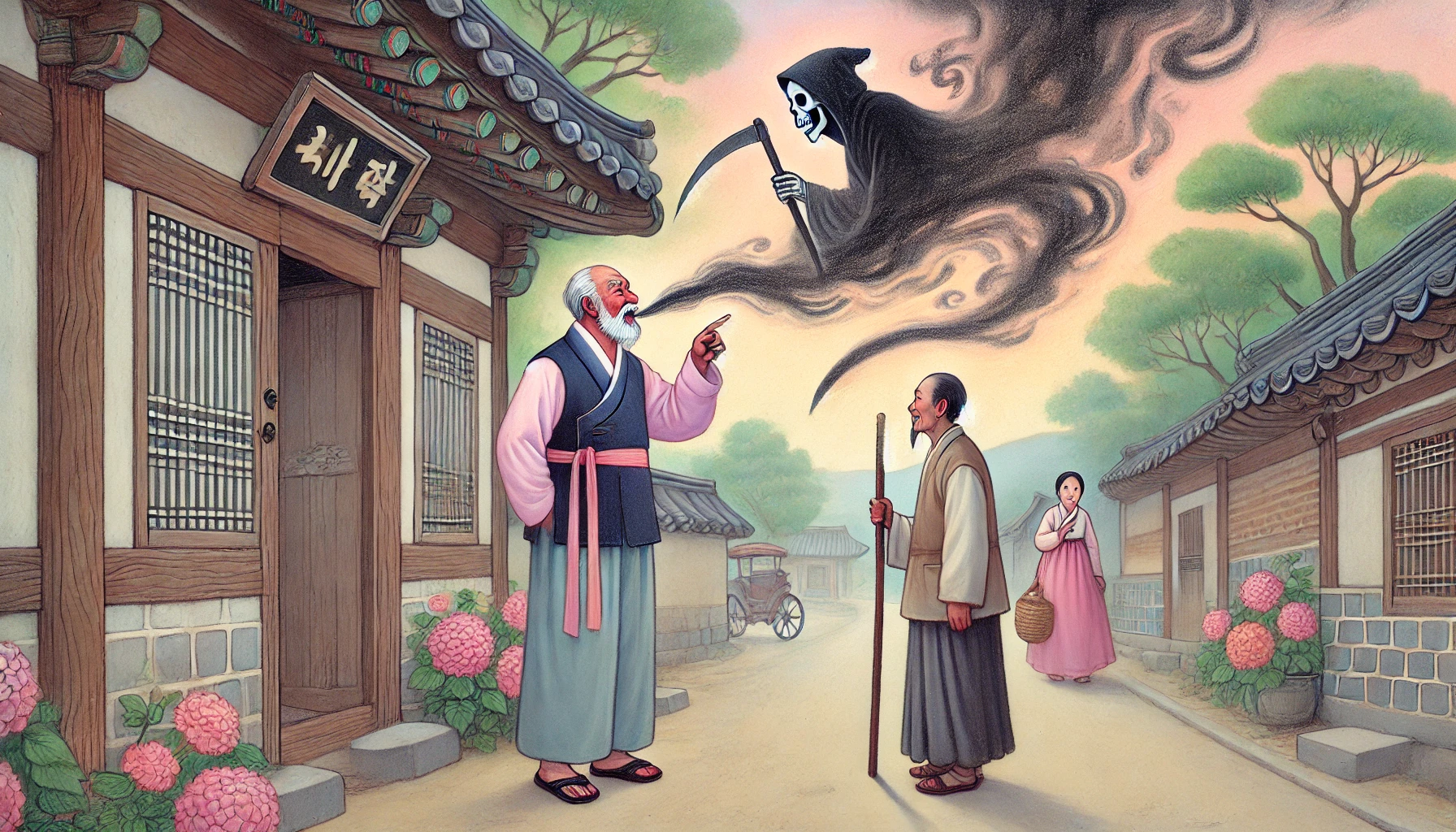 그는 마루에 앉아 곰방대를 두드리며 하루 종일 누군가를 헐뜯고 저주했습니다. 그러니 그의 주변에는 사람의 온기라고는 찾아볼 수 없었지요. 하인들은 그림자처럼 숨어다녔고, 동네 개들도 최 영감 발자국 소리만 들리면 꼬리를 내리고 도망갔습니다.