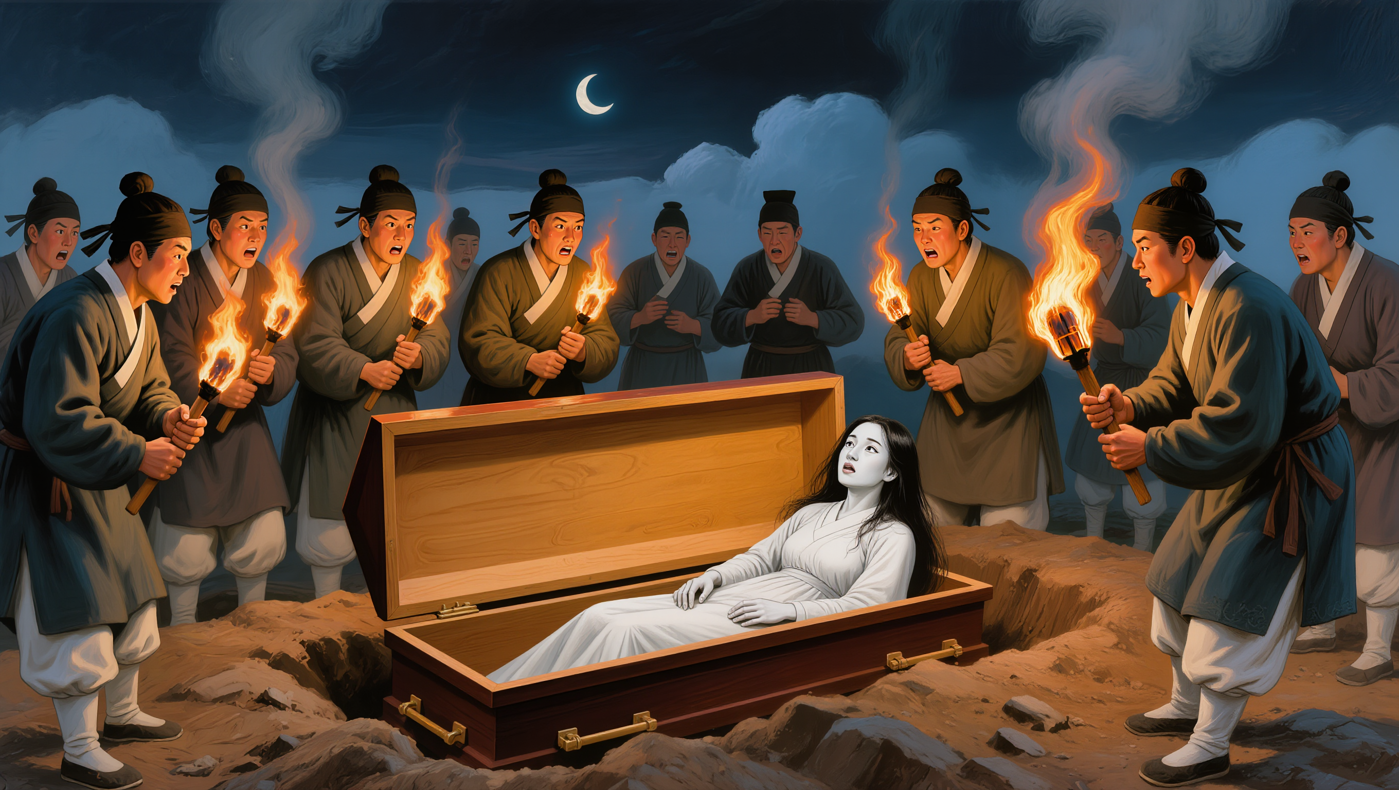 "여보! 당신이오? 정말 당신 살아있는 거요?" 남편이 미친 듯이 흙을 파헤치기 시작했습니다. 횃불 아래에서 삽질 소리만 요란하게 울려 퍼졌습니다. 마침내 흙더미가 걷히고 차가운 관 뚜껑이 모습을 드러냈습니다. 아, 그 순간의 광경을 어찌 설명해야 할까요! 관 뚜껑을 열자마자 하얀 염습 천을 온몸에 감은 박 씨 부인이 상체를 벌떡 일으키며 크게 숨을 몰아쉬는 것이었습니다.
