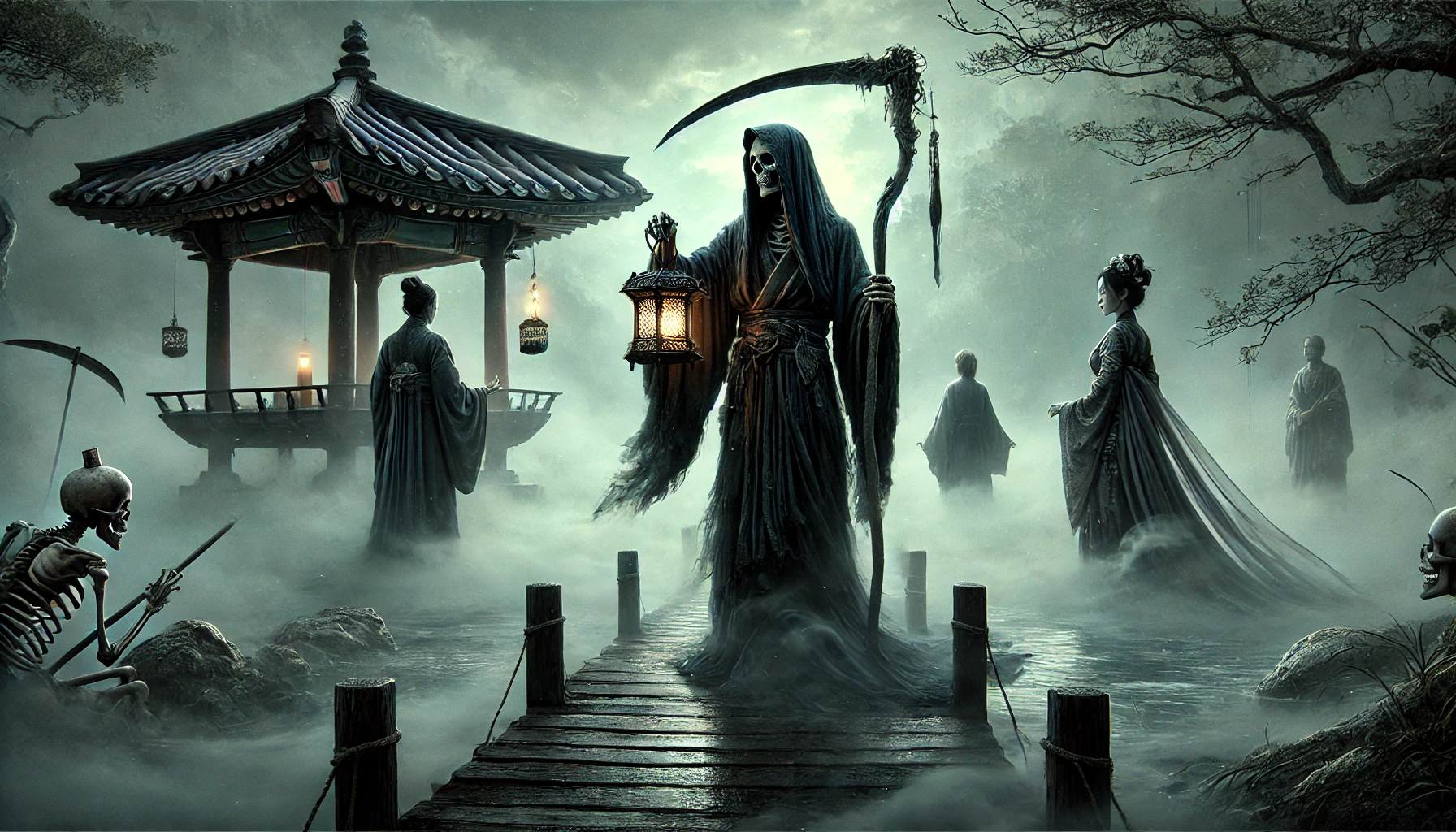 칠흑 같은 어둠 속, 희미한 달빛만이 비추는 밤. 검은 갓과 붉은 도포를 입은 한 저승사자가 높은 소나무 위에 앉아 있다. 그의 손에는 오래된 명단이 들려 있고, 그 옆에는 인간의 혼을 담는 붉은 병이 놓여 있다. 사자의 얼굴은 보이지 않지만, 그의 목소리는 깊고 서늘하다.