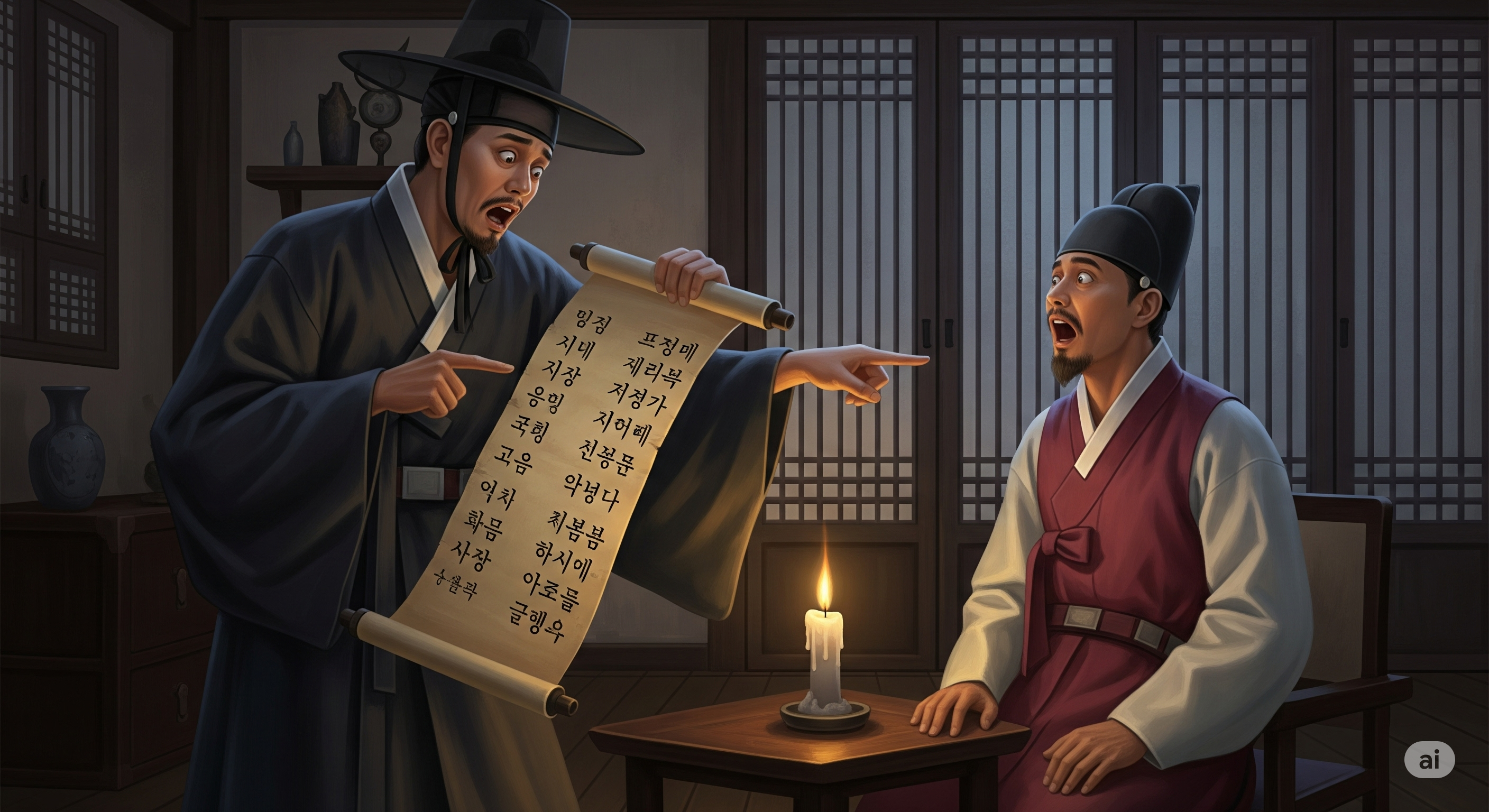 "그날 오후, 정말로 한양에서 가장 유명한 학자 박문수가 김갑수를 찾아왔습니다. 그는 김갑수가 하룻밤 사이에 쓴 글들을 보고 깊은 감명을 받았다고 했지요.