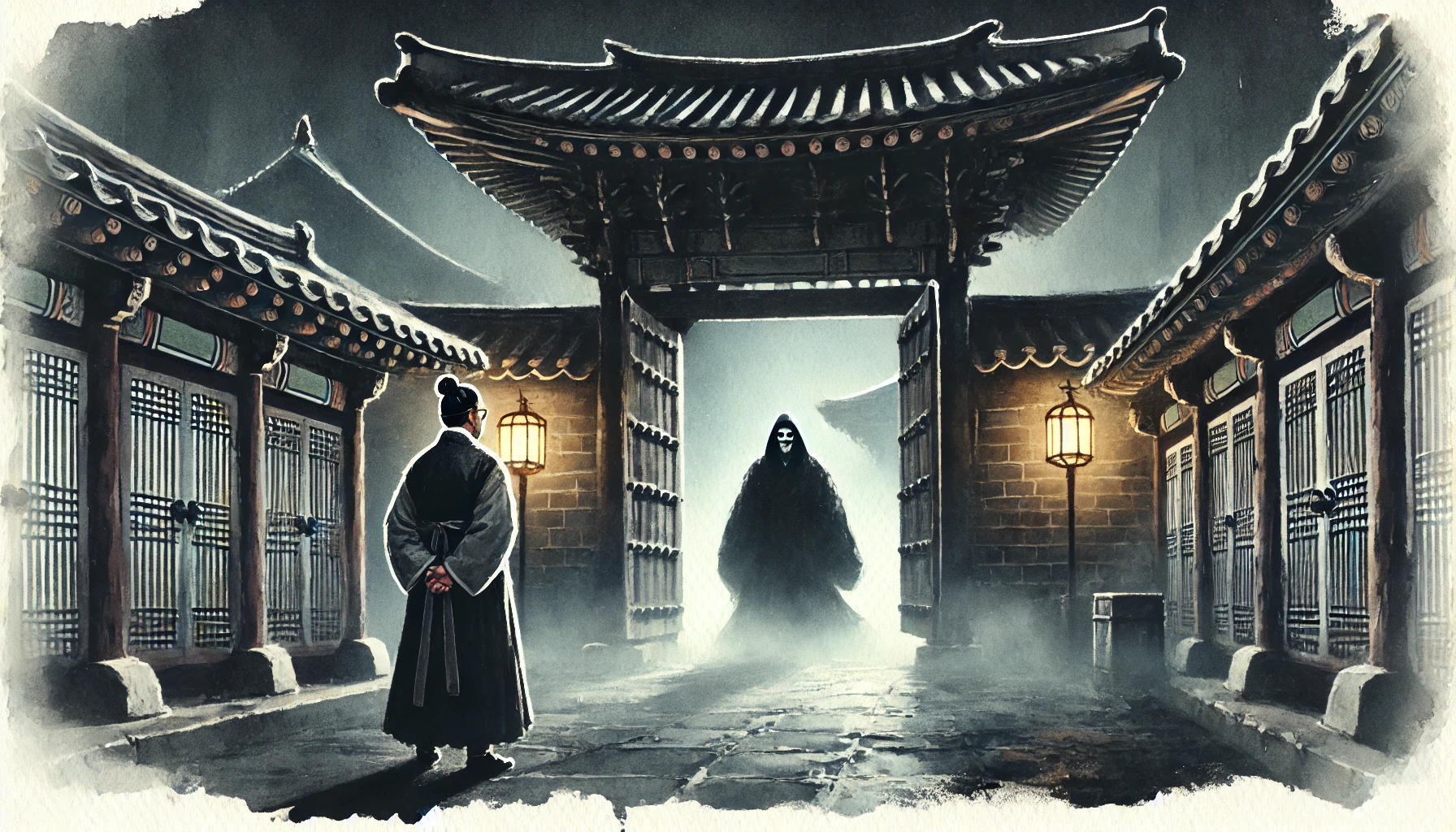 그때였습니다. 상석에 앉은 김 대감의 눈에, 대문 틈 사이로 언뜻 스쳐 지나가는 검은 옷자락이 보인 것은. 사람이 아닙니다. 분명 사람은 아닌데, 사람의 형상을 한 그 무언가가 잔치판을 뚫어지게 응시하고 있다는 느낌. 김 대감은 자기도 모르게 "헉!" 하고 숨을 들이켰습니다. 주위 사람들은 "대감마님, 왜 그러십니까? 어디 편찮으십니까?" 하고 묻는데, 김 대감 귀에는 그 소리가 웅웅거리며 멀게만 들립니다. 오직 하나, 저 어둠 속에서 자기를 노려보는 차가운 시선만이 뇌리에 박혀, 뼛속까지 시려오는 공포를 느끼며 김 대감은 덜덜 떨리는 손으로 술잔을 내려놓았습니다. 이 화려한 잔치 끝에, 초대받지 않은 무서운 손님이 당도했음을 직감한 것입니다.