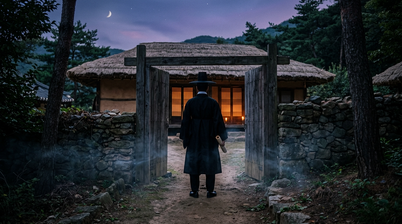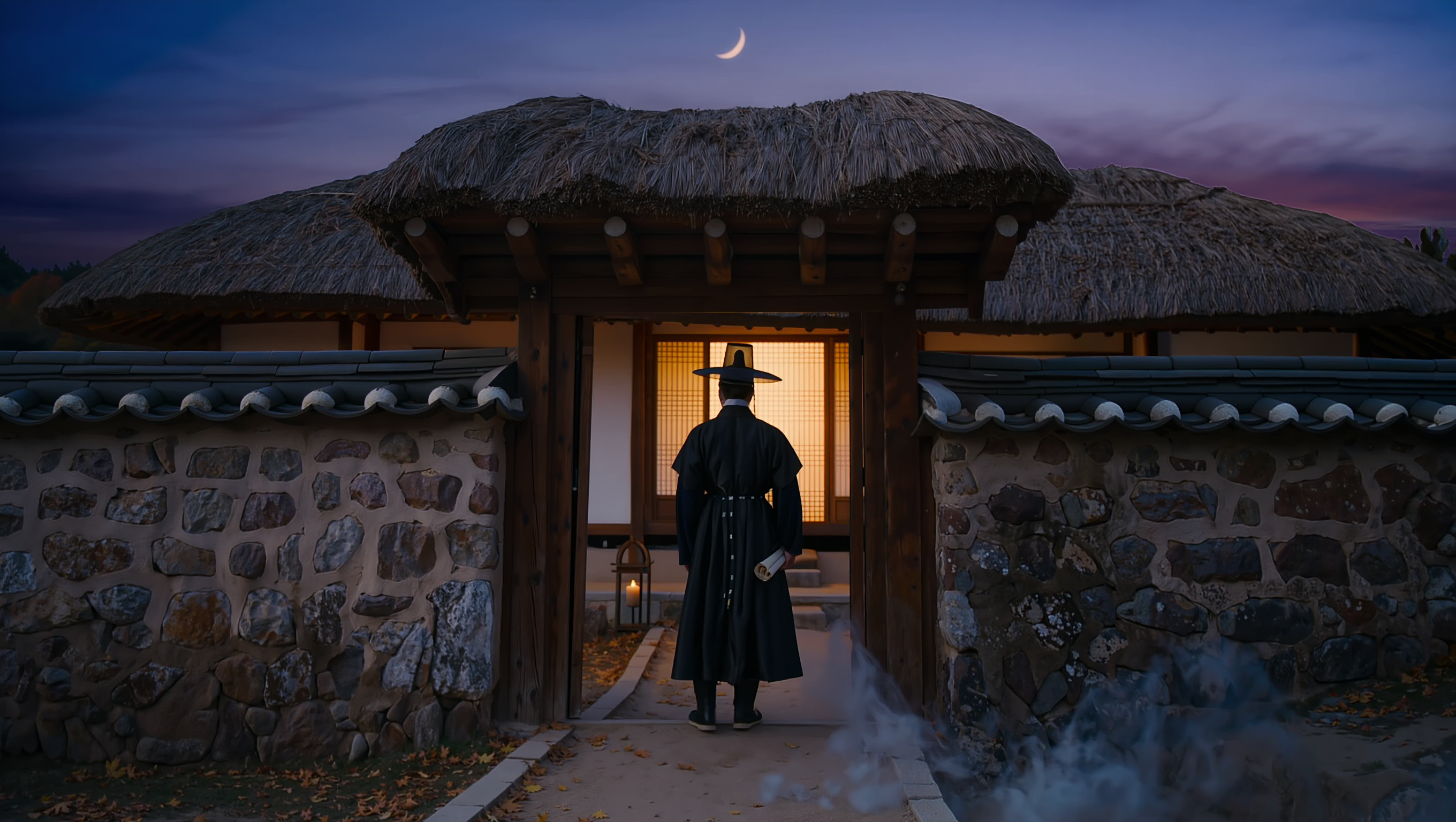 A photorealistic cinematic scene of a mysterious figure standing at the wooden gate of a traditional Korean thatched-roof house at twilight. The figure wears an entirely black traditional Korean outfit including a black gat hat, black dopo robe, and black shoes, holding a rolled parchment scroll in one hand. The figure is seen from behind, silhouetted against a dim amber glow emanating from inside the house. A narrow dirt path leads to the gate, flanked by old stone walls. Faint wisps of ethereal blue-white mist float around the figure's feet suggesting a supernatural presence. The sky is deep indigo transitioning to dark purple with a single crescent moon. Warm candlelight flickers through the paper-screen door of the house creating a contrast between the warmth of life inside and the cold stillness of the visitor outside. The mood is solemn yet strangely peaceful. Ultra-detailed, atmospheric lighting, shallow depth of field, 16:9 aspect ratio, no text.