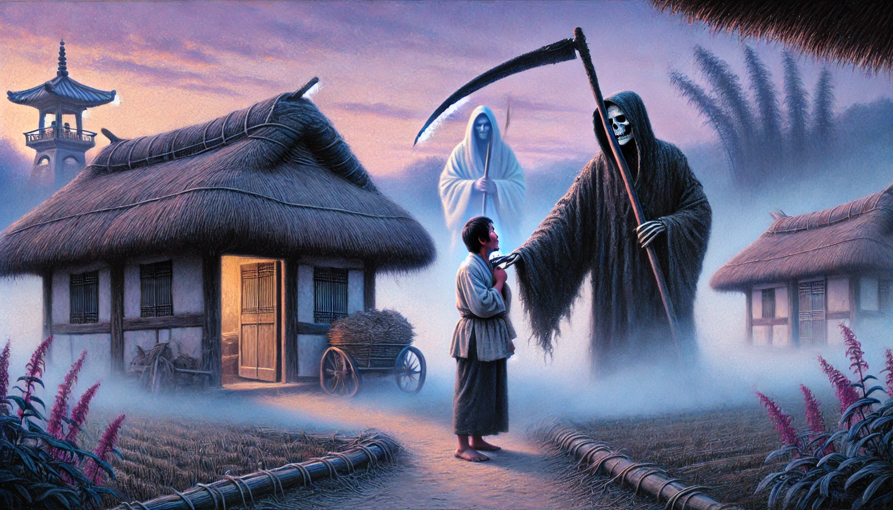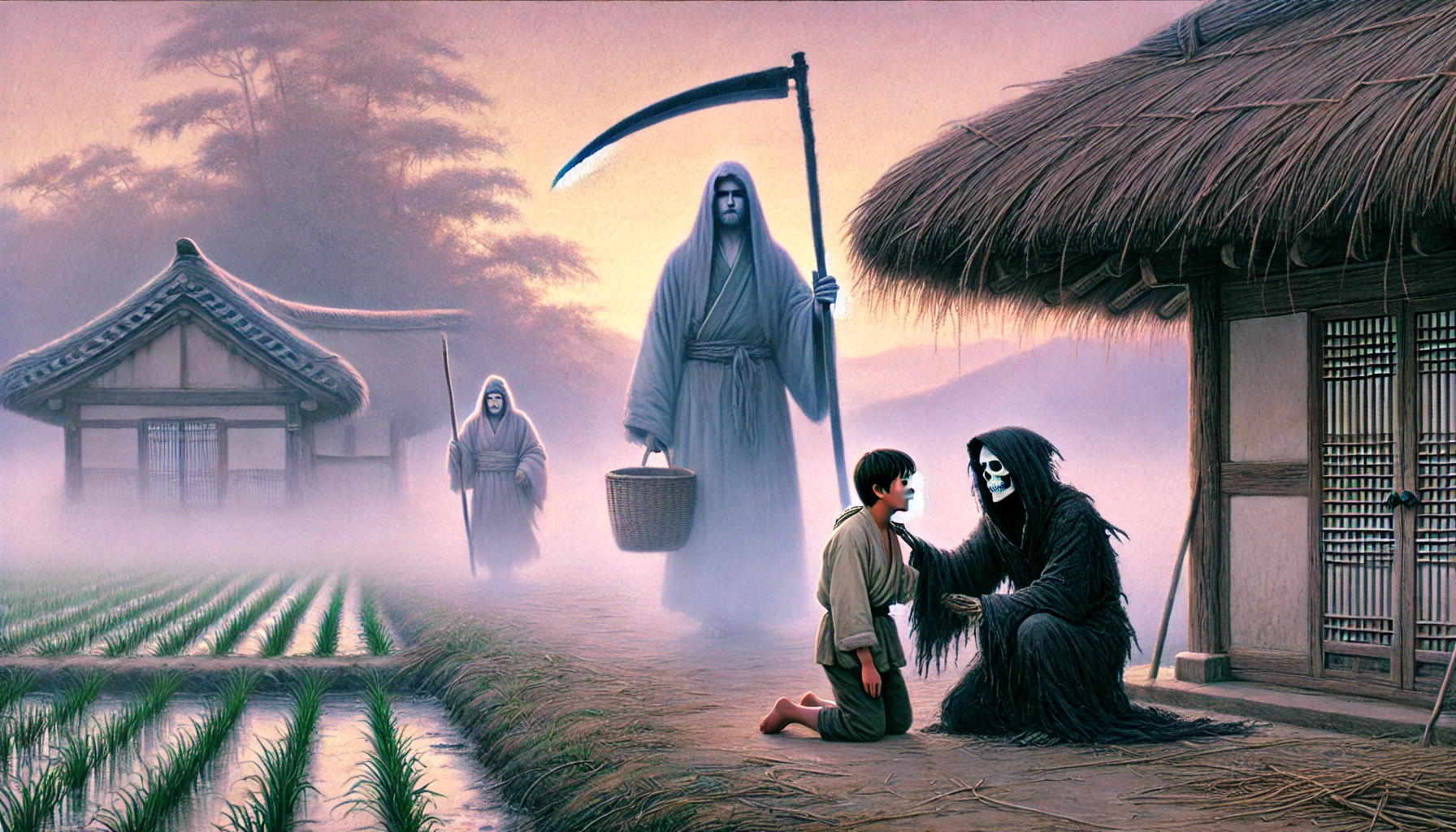 월직은 죽 그릇을 깨끗이 비웠습니다. 따뜻한 기운이 돌자, 비로소 공포에 질렸던 얼굴이 조금 펴지고 핏기가 돌았습니다. 그는 박 서방과 아내에게 다시 한번 깊이 고개를 숙였습니다. "나리 저는 이제 떠나야 합니다." "어디로 말이오? 또 잡히면 어쩌려고" "강림 어르신은 첫닭이 울어 물러가셨지만, 곧 해가 뜨면 반드시 다시 오실 겁니다. 그 전에 몸을 피해야 합니다. 저승의 법도를 어겼으니 돌아가 염라대왕님께 벌을 받는 것은 마땅하나, '소멸'되는 것만은 피하고 싶었습니다. 이 은혜는 저승에 가서도 잊지 않겠습니다." 월직은 자리에서 일어나 부서진 문을 향해 걸어가다 멈칫 했습니다. 그는 박 서방의 남루한 집안을 다시 한번 천천히 둘러보았습니다. 텅 빈 뒤주, 낡아서 날이 무뎌진 농기구, 박 서방 부부가 입은 해진 옷 "나리." "왜 그러시오?" "나리 덕분에 제 목숨을 구했으나 나리께서는 저 무서운 '강림' 어르신의 눈에 띄고 말았습니다. 저 분은 한번 본 것을 잊지 않으십니다. 나리께서 오늘 지은 '죄'는 나리의 명부(名簿)에 고스란히 기록되었을 것입니다. 이 어찌 저의 마음이 편하겠습니까." 박 서방은 그 말에 가슴이 덜컥 내려앉았습니다. "하지만 나리의 목숨을 구해주신 이 은혜를 갚지 않고는 저승에 돌아가서도 발을 뻗지 못할 것 같습니다." 월직은 박 서방 곁으로 다가와 심각한 표정으로 말했습니다. "나리께서는 재물이 필요하십니다." 박 서방은 손을 내저었습니다. "됐소 사람 목숨 구한 일을 어찌 재물로 따지겠소. 어서 몸이나 피하시오." "아닙니다 나리." 월직은 단호했습니다. "저승의 법도를 어기고 인간사에 개입하는 것은 저 또한 큰 죄를 짓는 것입니다. 허나 이미 나리 때문에 큰 죄를 지었으니, 죄 하나를 더 짓는 셈 치겠습니다. 이것은 저승의 법도를 어기는 천기누설(天氣漏泄)입니다. 저 또한 소멸 다음가는 벌을 받을 각오로 나리께만 드리는 것입니다." 박 서방의 아내가 그 말에 마른 침을 삼키며 다가왔습니다. 월직은 박 서방의 귀에 대고 아주 나지막이 속삭였습니다. "잘 들으십시오. 이곳에서 백 리(里) 떨어진 한양 읍내 고을 원님의 집 앞입니다. 그 집 앞마당에는 고을 전체를 덮을 만큼 거대한 감나무가 한 그루 있습니다. 그 나무는 고을의 수호목(守護木)으로 불리며 원님 또한 지극히 아끼는 나무지요." "그 감나무가 어쨌다는 게요?" "정확히 사흘 뒤 해가 질 녘 그 거대한 나무가 맑은 하늘에 벼락을 맞아 쓰러질 것입니다. 원님은 필시 불길한 징조라 여겨 난리가 나겠지요. 그리고 그 나무를 당장 파내라 명할 것입니다." "벼락?" "그렇습니다. 원님이 사람들을 시켜 그 뿌리를 파내다 보면 그 아래에서 백 년 묵은 거대한 쇠 궤짝이 나올 것입니다. 그것은 백 년 전 지독한 탐관오리가 백성의 고혈을 짜내 숨겨둔 재물이라 본래 주인이 없는 재물입니다." "그럼 그걸 내가 어찌" "물론 그 큰 궤짝은 원님이 발견하는 즉시 '흉물'이라 부르며 국고로 환수할 것입니다. 나리께서 감히 손댈 수 없는 물건이지요. 하지만 나리." 월직의 눈이 어둠 속에서 빛났습니다. "그 탐관오리가 가장 아끼던 진짜 비자금은 그 궤짝에 넣어두지 않았습니다. 그 거대한 나무 뿌리 정반대편 즉, 원님의 집 담벼락 밑 구석진 자리입니다. 그곳을 사흘 뒤 나무가 쓰러진 그날 밤 아무도 없는 자시(子時)에 가셔서 정확히 세 척(尺)만 파 보십시오. 작은 검은색 흙항아리가 하나 묻혀 있습니다. 그것 역시 그 탐관오리가 몰래 빼돌린 비자금입니다. 그 항아리의 존재는 이승의 아무도 모르고 오직 저승의 명부에만 기록되어 있습니다. 그것을 취하십시오. 그것이 나리께 드리는 저의 목숨 값입니다." 박 서방은 어안이 벙벙했습니다. "부디 이 재물로 나리처럼 선한 마음을 잃지 마시고 부인과 함께 행복하게 사십시오. 나리께서 부자가 되셔야, 저 '강림' 어르신도 나리를 함부로 대하지 못할 것입니다. 저는 이만 갑니다. 부디 만수무강 하십시오." 월직은 마지막 큰절을 올리고는, 열린 문 틈으로 스며드는 희미한 새벽빛 속으로 안개처럼 스르르 사라져 버렸습니다.