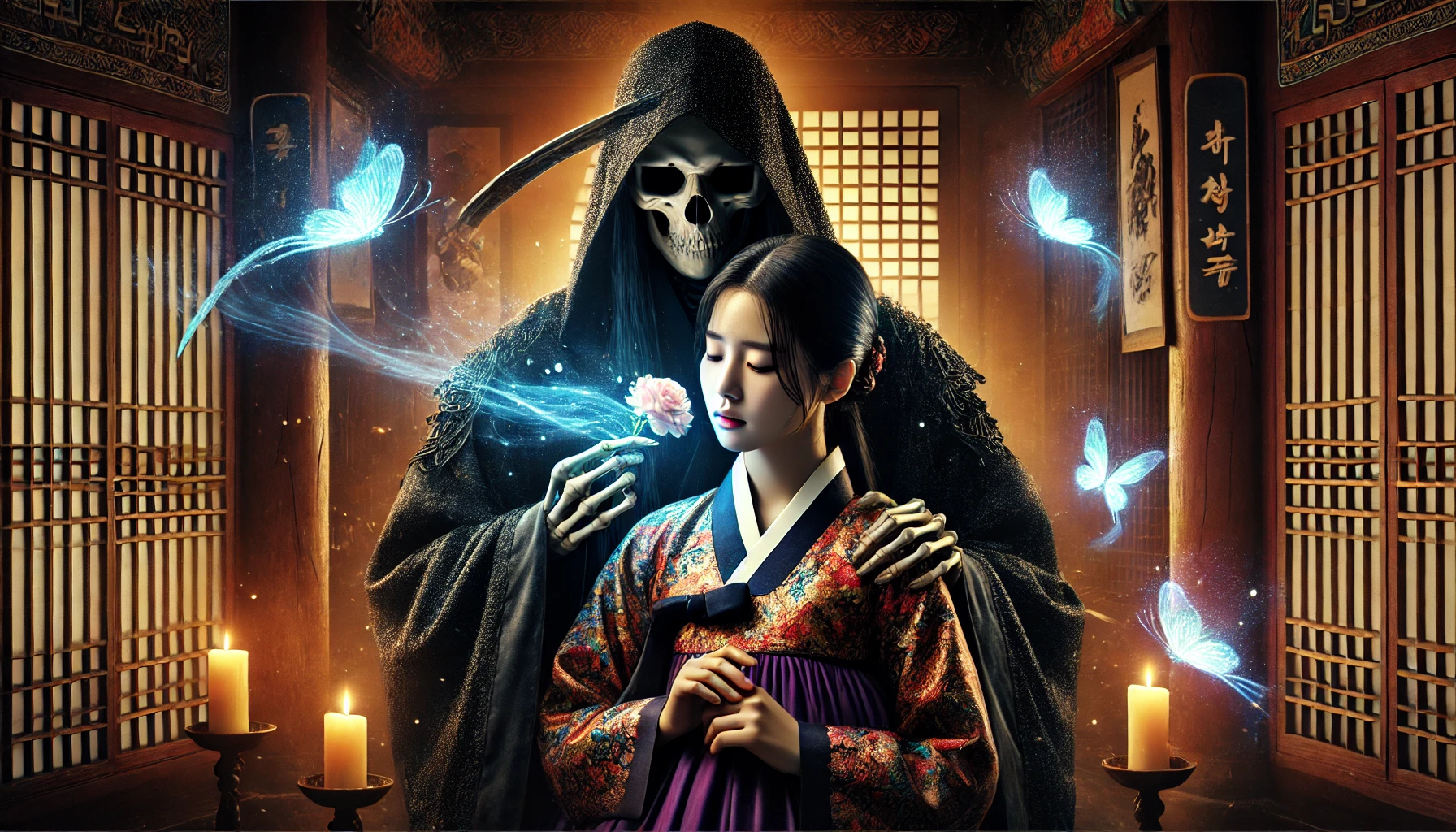 마침내 약속된 운명의 날, 보름달이 세상을 하얗게 비추는 밤이었습니다. 매혹은 월향루의 모든 소란을 뒤로하고, 가장 깊숙한 자신의 방에서 조용히 죽음을 기다리고 있었습니다. 그녀는 지난 며칠간, 자신이 평생 모아온 모든 비단옷과 값비싼 장신구들을 불태워 버렸습니다. 화려했던 기생 ‘매혹’의 모든 흔적을 지우고, 한 사람의 ‘여인’으로서 그를 맞이하고 싶었기 때문입니다. 그녀는 깨끗한 흰 소복을 입고 머리를 단정히 빗어 내린 채, 방 한가운데에 고요히 앉아 있었습니다. 이윽고 방 안의 공기가 차가워지고, 촛불이 흔들리더니, 방 한가운데에 저승사자가 모습을 드러냈습니다. 그의 손에는 저승의 법도를 상징하는 붉은 명부와, 혼을 묶는 쇠사슬이 들려 있었습니다. 그는 더 이상 그녀의 연인이 아니었습니다. 그는 죽음의 신, 저승사자 본연의 모습으로 돌아와 있었습니다.